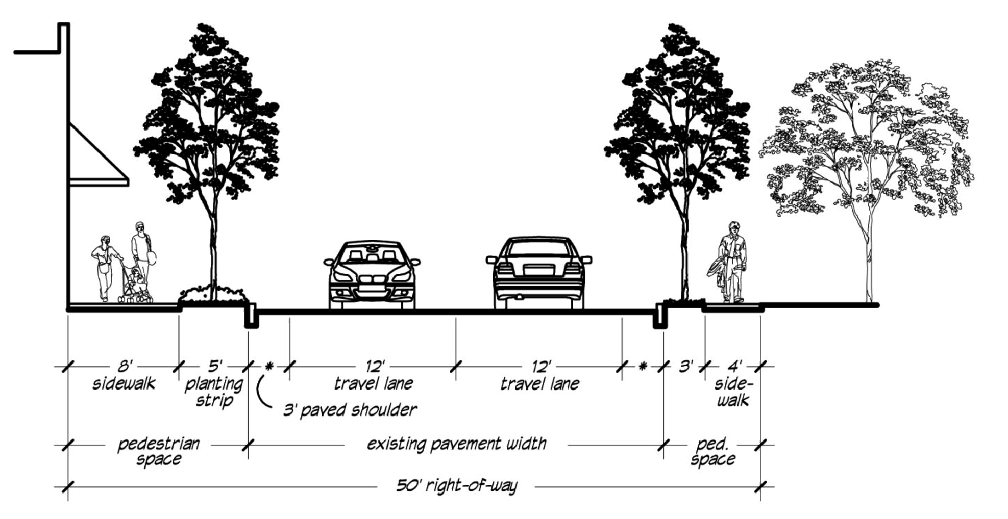 Street trees are required to be within a minimum four-foot planting strip located between the existing street and proposed sidewalk.