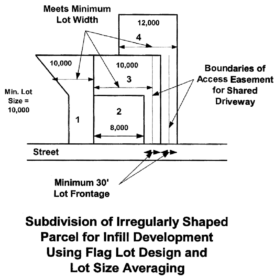 Where unique site specific conditions exist, such as an irregular shape or other unique conditions, an infill developer or subdivider may propose and the City Planning Commission may approve a flexible development incentive called lot size averaging. This incentive allows development applicants to reduce one or more lots below the minimum lot size established for the zoning district in which the residential infill development project is located. In order to apply this provision, the proposed residential infill development project must meet the following requirements: