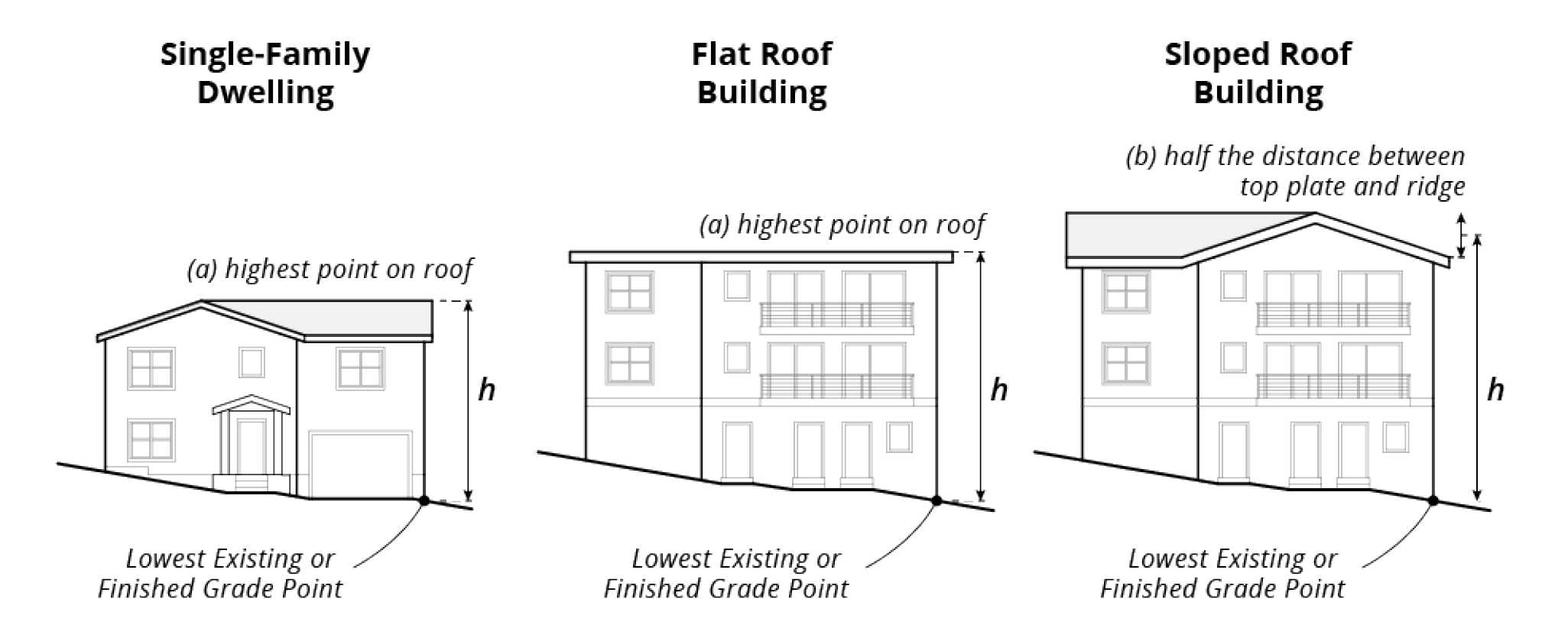 Building height is measured from the existing or finished grade point, whichever is lower, of that portion of the lot covered by each building to the highest point on the roof of that building, except as provided below.