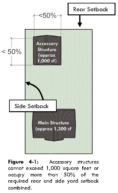 Percentage of required setbacks occupied. Unless otherwise specified in this Land Use Code, detached accessory buildings shall occupy no more than fifty (50) percent of the area of the required side and rear setbacks combined.
