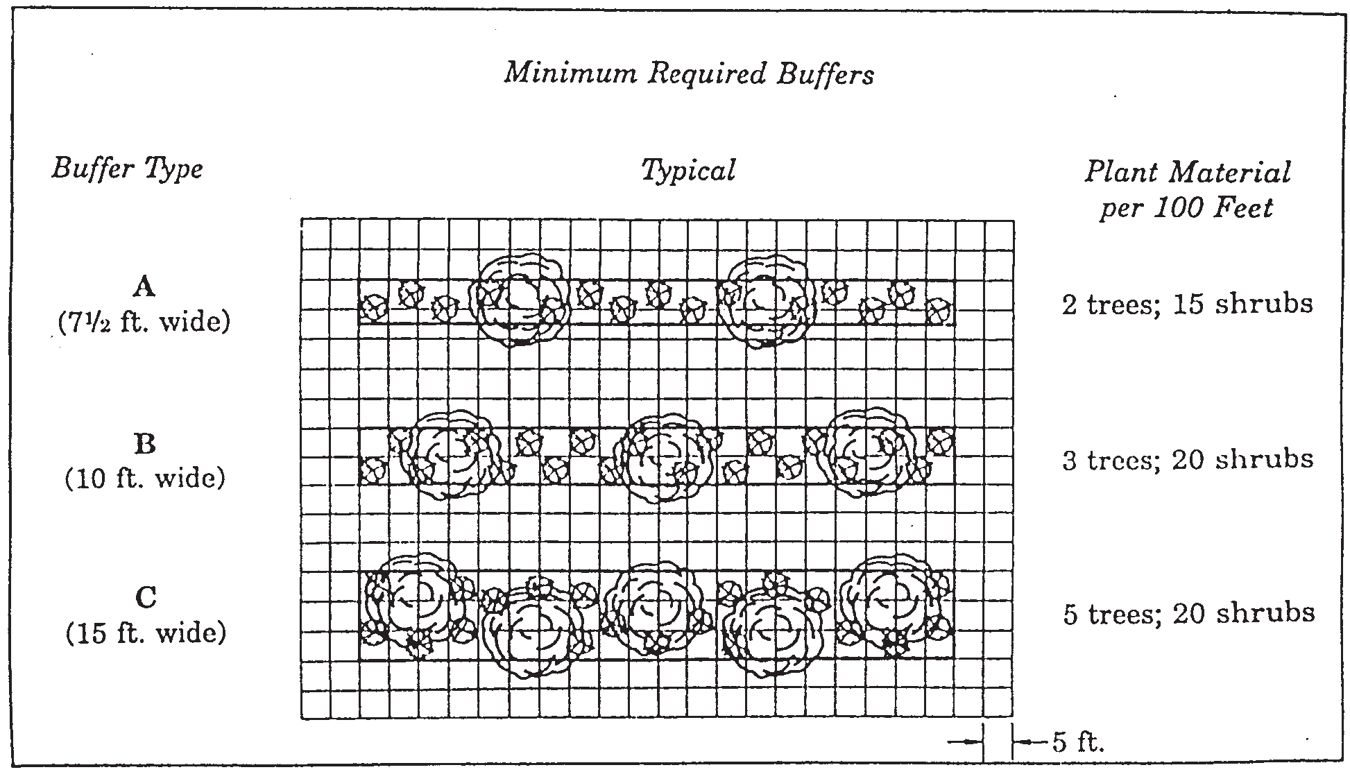 The standards for buffer zones are set out in the following illustrations that specify the number of plants required per 100 linear feet. To determine the total number of plants required, the length of each side of the property requiring a buffer shall be divided by 100 and multiplied by the number of plants shown in the illustration. The plants shall be spread reasonably evenly along the length of the buffer.