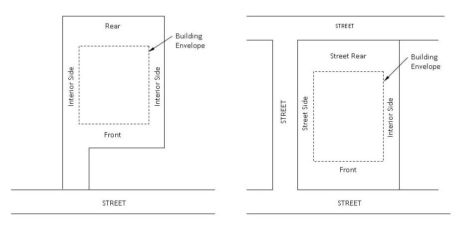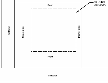 The side yard setbacks connect the front and rear setbacks and are perpendicular to them on square or rectangular lots.