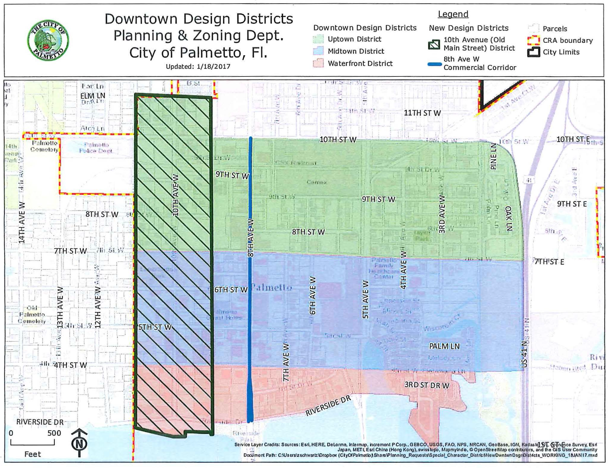 Downtown waterfront district means the geographic area bounded by the southernmost boundary of Riverside Drive until its eastern terminus, the Manatee River, the easternmost boundary of 11th Avenue West, the southernmost boundary of 4th Street West and the westernmost boundary of U.S. 41/301.