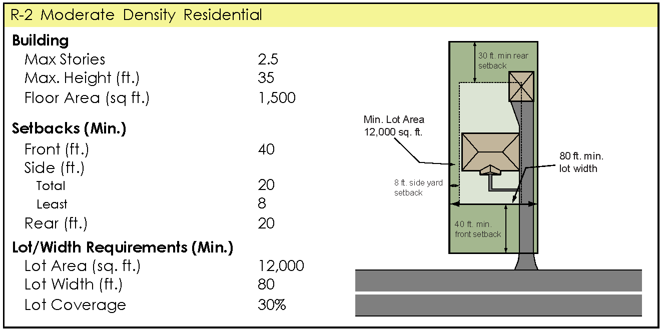 "R-2," Moderate Density Residential District. The R-2 District is intended to encompass much of the city's existing single-family residential development and accommodate similarly situated new development at densities of about three units per acre.