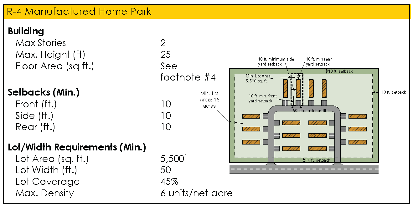 "R-4," Manufactured Home Community District. Accommodating the particular needs for manufactured home communities is the purpose of this district. The R-4 District is well suited to serving as a transitional use between other residential development and intense non-residential uses. Densities up to six units per acre are permitted and public water and sanitary sewer are required.