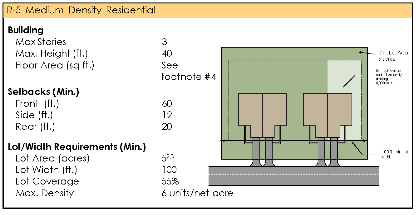 "R-5," Medium Density Residential District. This district is intended to provide for housing options other than single-family dwellings, at densities of up to six units per acre. The R-5 District lends itself to serving as a buffer or transitional zone between lower density residential and non-residential development. Two-family dwellings and town homes are permitted, along with compatible public, quasi-public and institutional uses. Land within this district will be served by public sanitary sewer and water facilities.