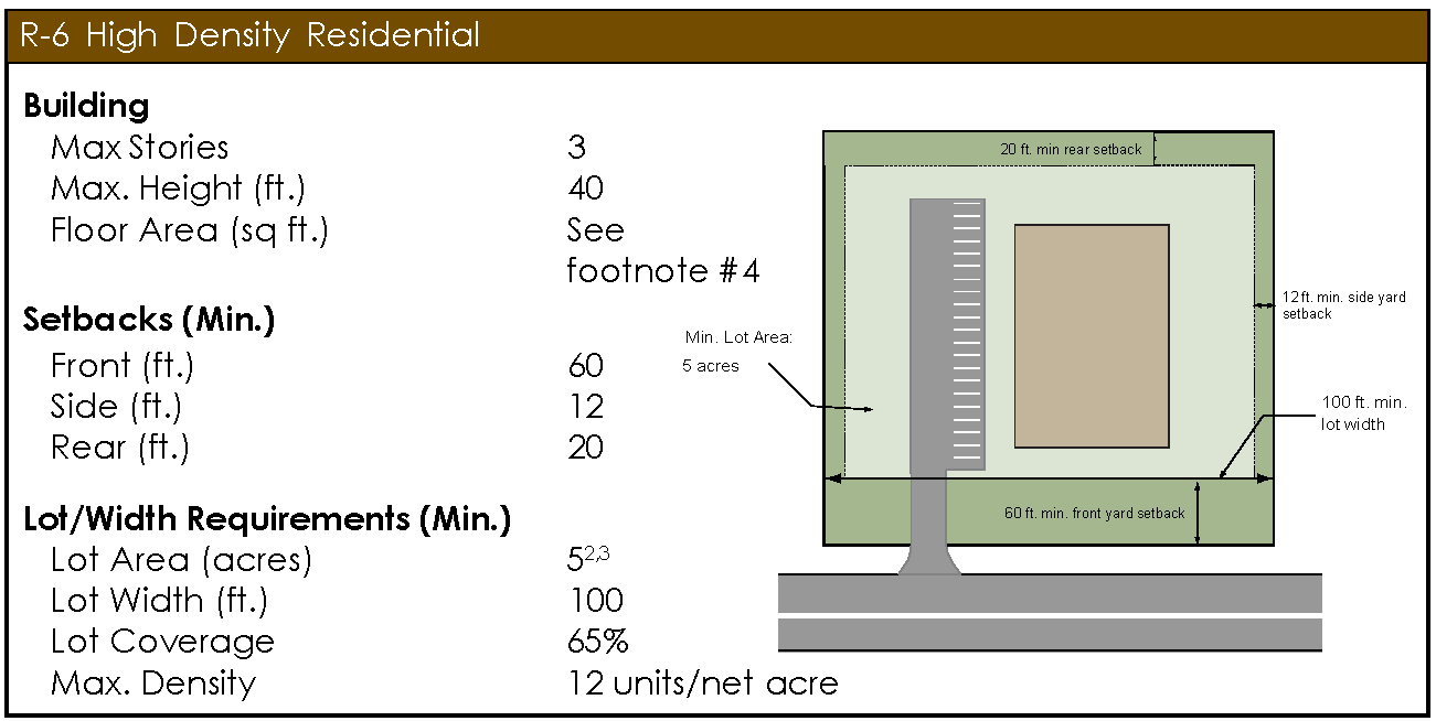 "R-6," High Density Residential District. The R-6 District is similar in character and purpose to the R-5 District, but also permits multiple family dwellings. It allows development at higher densities than any other district. Residential densities of up to 12 units per acre are permitted in this district.