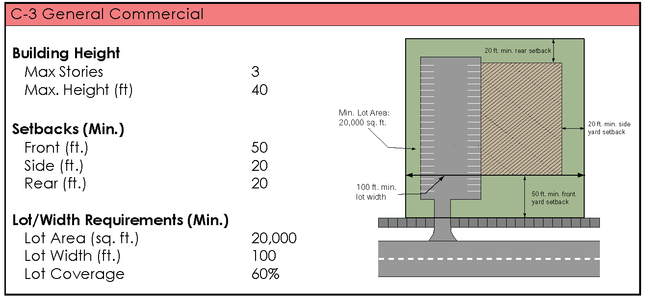"C-3," General Commercial District. The C-3 zoning district is intended primarily to accommodate a range of retail and service uses serving the broader needs of the community and the motoring public. Large-scale retailers, auto-related businesses and similar uses not generally appropriate for other commercial districts will be permitted. While the district will be established primarily along arterial roadways, care should be taken to ensure compatibility with adjacent uses and minimize conflicts with traffic along abutting streets.