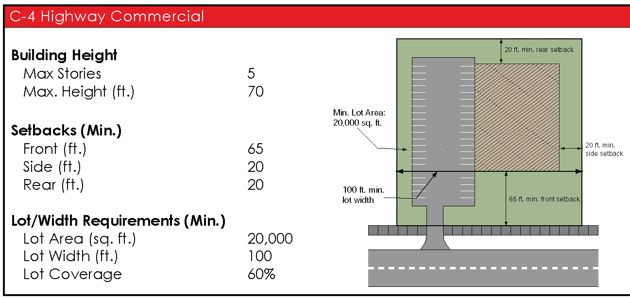 "C-4," Highway Commercial District. The C-4 zoning district is a specialized district intended to provide for those service uses catering to the motoring public along the interstate highway system and other high volume highways. Uses will be limited to auto-oriented uses and district boundaries will be confined to the immediate vicinity of interchanges and major intersections.