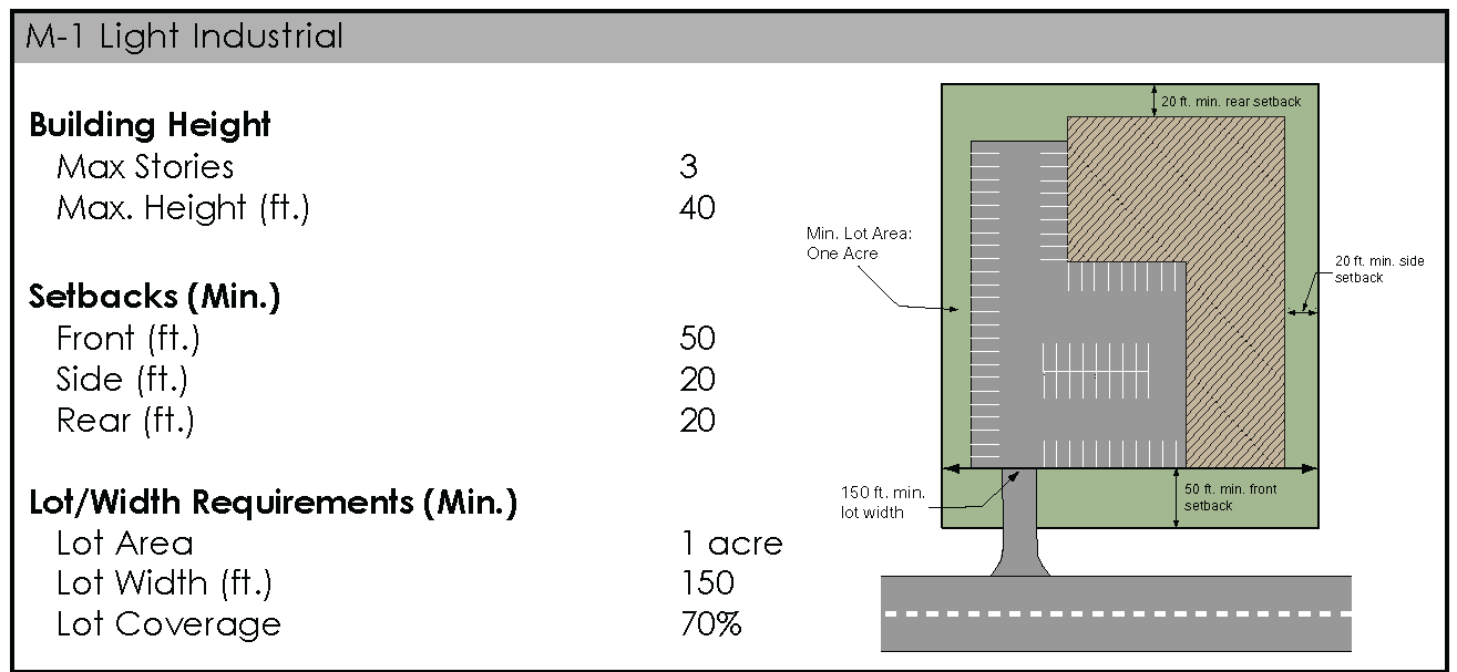 "M-1," Light Industrial District. The M-1 District is established for light industries such as light manufacturing or processing of previously refined materials and other industrial uses that have little or no adverse impact upon neighboring districts. This district also allows certain commercial uses of an industrial character or that are necessary to provide services to employees within the district. Limitations regarding the degree of noise, smoke, glare, odor and vibration are placed upon M-1 uses to preclude or minimize adverse effects upon nearby commercial or residential districts. It is intended that this district act as a transition between heavier manufacturing and non-industrial areas. Its purpose is to provide jobs for citizens of the community and surrounding area, establish a sustainable tax base and create value for property owners and the community.