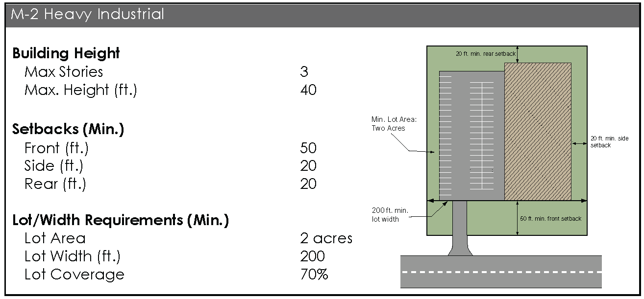 "M-2," Heavy Industrial District. The M-2 District is established to accommodate intense industrial uses that are primarily of a manufacturing, assembling and fabricating character. These tend to be large-scale or specialized industrial operations more likely to produce external physical effects impacting to some degree surrounding districts. This district is intended to be located in areas where the allowed uses can most efficiently utilize major roadways, utilities and other infrastructure, while minimizing potentially incompatible influences upon neighboring districts. Like the M-1 district, the M-2 district is also intended to support the economic vitality of the city through job creation and tax revenues.