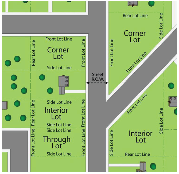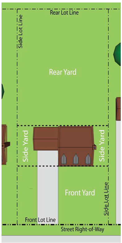 Yard, front. A yard between the front building line and the street right-of-way, extending across the full width of the lot between the side lot lines. On a corner lot, the primary front yard is that yard along the street that abuts the front lot line (see "lot line, front"). The secondary street front yard is also a front yard, but may be distinguished with different setback requirements in a district.