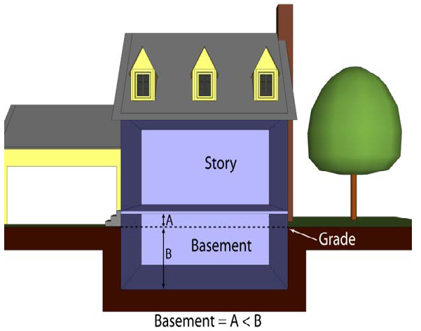 Basement. A room or rooms, or any part of a room having a floor level more than 48 inches below grade. Except when used for business purposes, a basement shall not be counted as a story in height or floor area measurement if the vertical distance between the basement floor and the average level of the finished grade is greater than the distance between the average level of the finished grade and the basement ceiling.