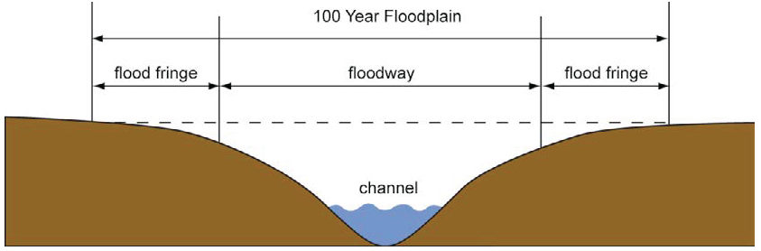 Floodplain. The area adjoining a river, stream, water course, or lake, subject to 100-year recurrence interval flood as delineated by the Federal Emergency Management Agency (FEMA). A floodplain shall include the stream channel, the overbank area, or the floodway, and the fringe areas of the floodway.
