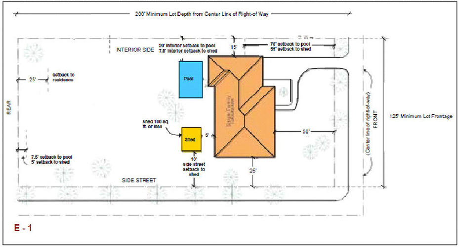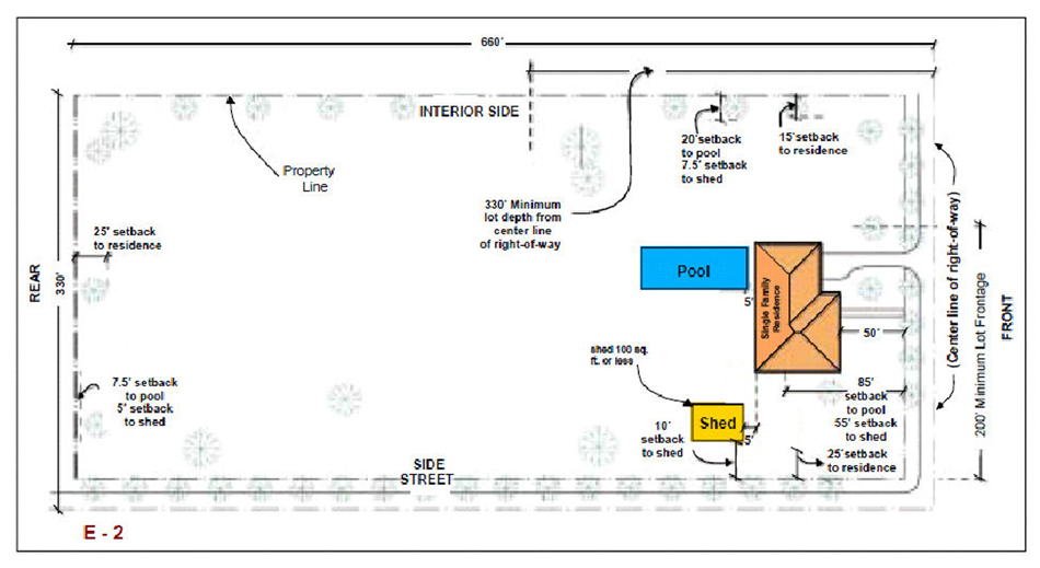 Barns, stables, sheds or other buildings used for the storage of equipment, feed, fertilizer, produce or other items ancillary for the permitted use. The use shall be accessory to the agricultural use conducted on the property provided, however, the structure shall be 50 feet from any residence under different ownership and any R or E District zoned property, unless approved after public hearing.