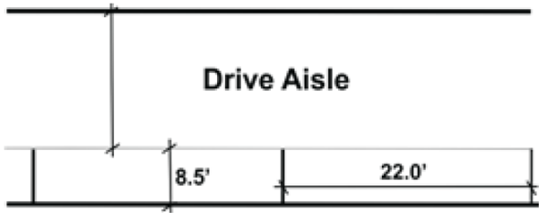 Parallel parking spaces should be a minimum of eight and one-half feet wide and 22 feet long. If a parallel space abuts no more than one other parallel space, and adequate access room is via angled curb, then the length may be reduced to 20 feet.