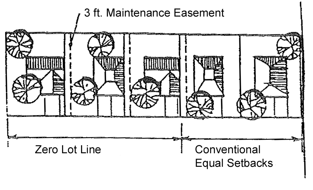 When a group or cluster of three (3) or more single-family dwellings are proposed for development as a unit, the side yard requirement may be reduced subject to the approval of the Town Administrator. However, the minimum spacing between two (2) structures shall not be less than twelve (12) feet. In the case of zero-lot-line developments, permitted by this provision, a minimum of a three-foot-wide maintenance easement shall be provided on the property adjacent to the wall that is placed along the side lot line.