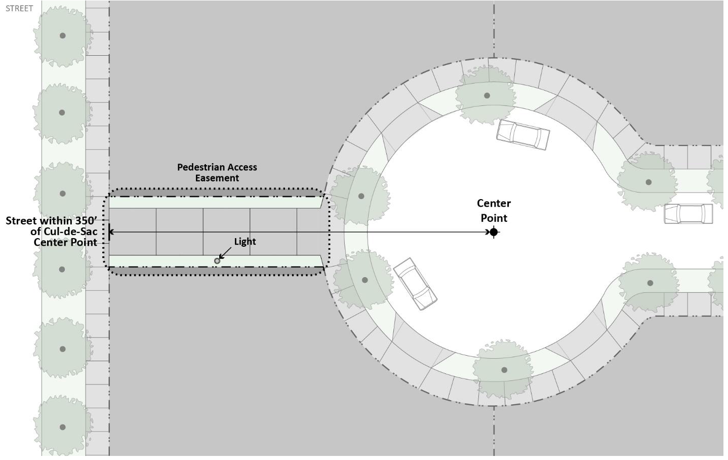 Mid-block pedestrian access shall be provided along a cut-through public easement between lots at the approximate center of the block for all blocks longer than 800 feet. This access shall meet the standards for pedestrian crossings in X-3.B.1.c.(1)(c) (Pedestrian Connection from a Cul-de-Sac). Refer to Figure X-3-A (Pedestrian Connection from Cul-de-Sac).