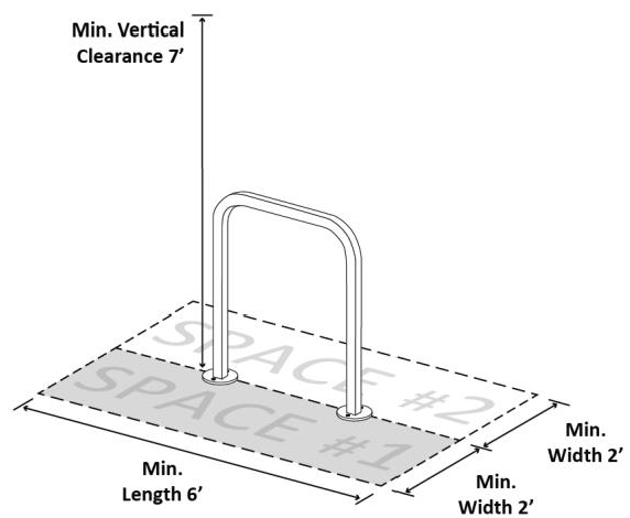 Dimensions. Each bicycle parking space shall have a minimum width of two feet, minimum length of six feet, and minimum vertical clearance of seven feet.