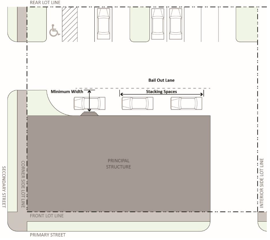 Bailout Lane. Drive through lanes shall include a bailout lane, which shall run parallel to the drive through lane, have a minimum width of ten feet, and provide unobstructed exit capability to all vehicles that have entered the drive-through lane. A drive aisle may also serve as the bailout lane provided it meets the requirements of this section.
