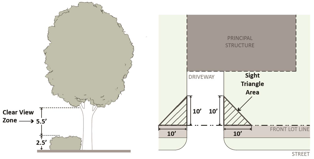 Visibility. No building, structure, sign, or landscape element shall obstruct the area between 2.5 feet and eight feet in height within the sight triangle area on each side of any driveway. Beginning at the intersection of the driveway with the lot line, the sight triangle shall be formed by measuring ten feet along the lot line in the opposite direction of the driveway and ten feet along the driveway in the opposite direction of the lot line, then connecting the endpoints of the lines across the subject property (refer to Figure V-9-A. Visibility at Driveways).
