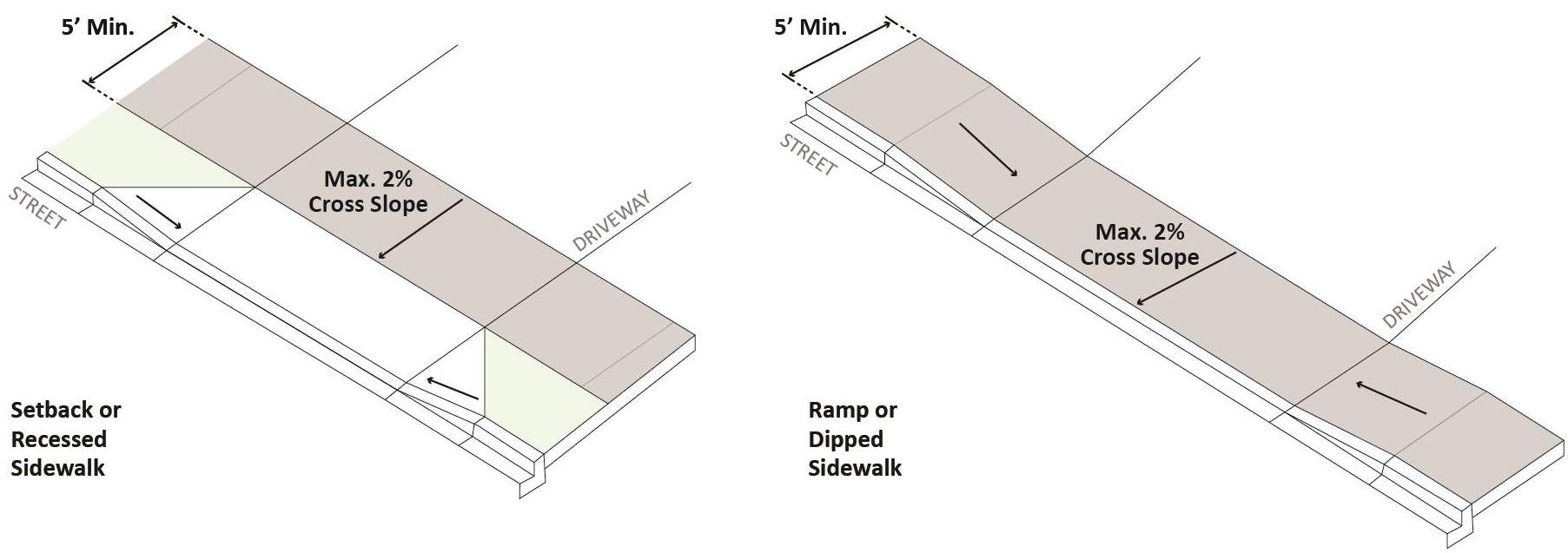 Sidewalk and Driveway Intersection. In locations that are crossed by a driveway, a sidewalk constructed of a permanent, concrete surface with a minimum width of five feet must be provided. In locations that a sidepath is crossed by a driveway, the provided sidewalk may be constructed of a material other than concrete that is a continuation of the adjacent sidepath material. In all instances, driveway aprons installed within the right-of-way shall be constructed of concrete material. The sidewalk shall remain level across the driveway with a running slope not to exceed the grade of the adjacent roadway, and a cross slope not to exceed two percent. Refer to Figure V-9-B. Sidewalk and Driveway Intersection Designs.