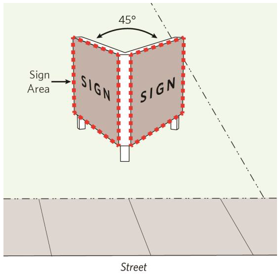 Signs with Multiple Faces. For signs with multiple faces, if the interior angle between the sign faces is 45 degrees or less, sign area is the area of one sign face. If the angle between the sign faces is greater than 45 degrees, sign area is the sum of the areas of the sign faces. Sign area does not include any supporting framework or bracing, unless such framework or bracing is part of the message or sign face.