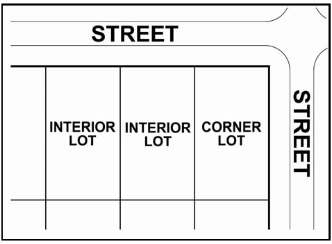 For reference, a typical corner lot is a lot situated at the junction of, and abutting, two (2) or more intersecting streets. See Figure 1: Corner Lot below.