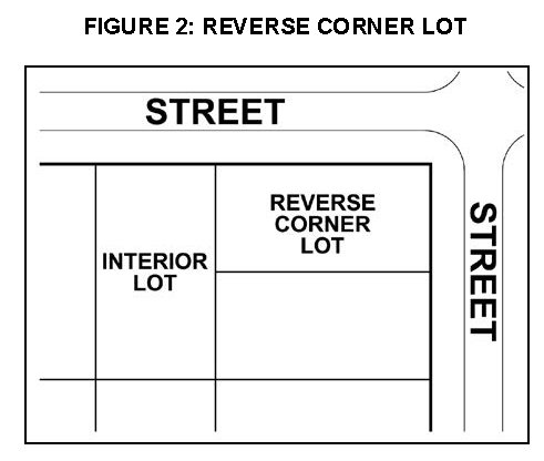 A reverse corner lot is a corner lot where the side lot line adjoining a street is substantially a continuation of the front lot line of the first lot to its rear. See Figure 2: Reverse Corner Lot below.