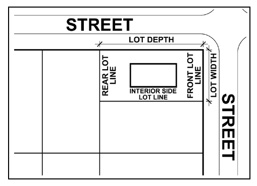 FIGURE 3—STEP 1: On a reverse corner lot, the lot line used to determine the location of the front yard and to measure lot width shall be the shorter street frontage.