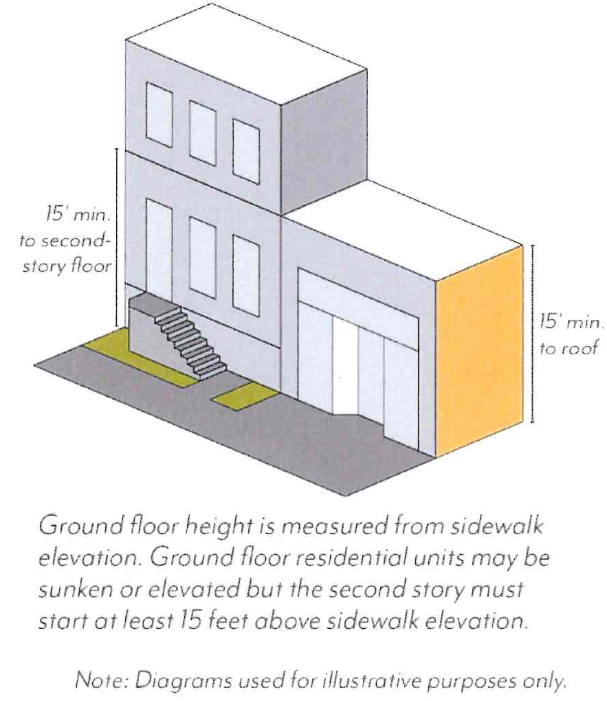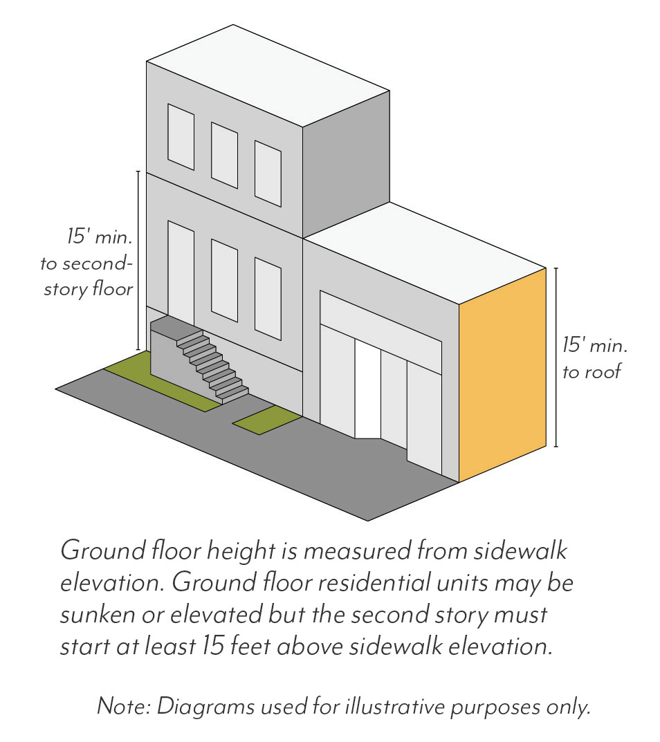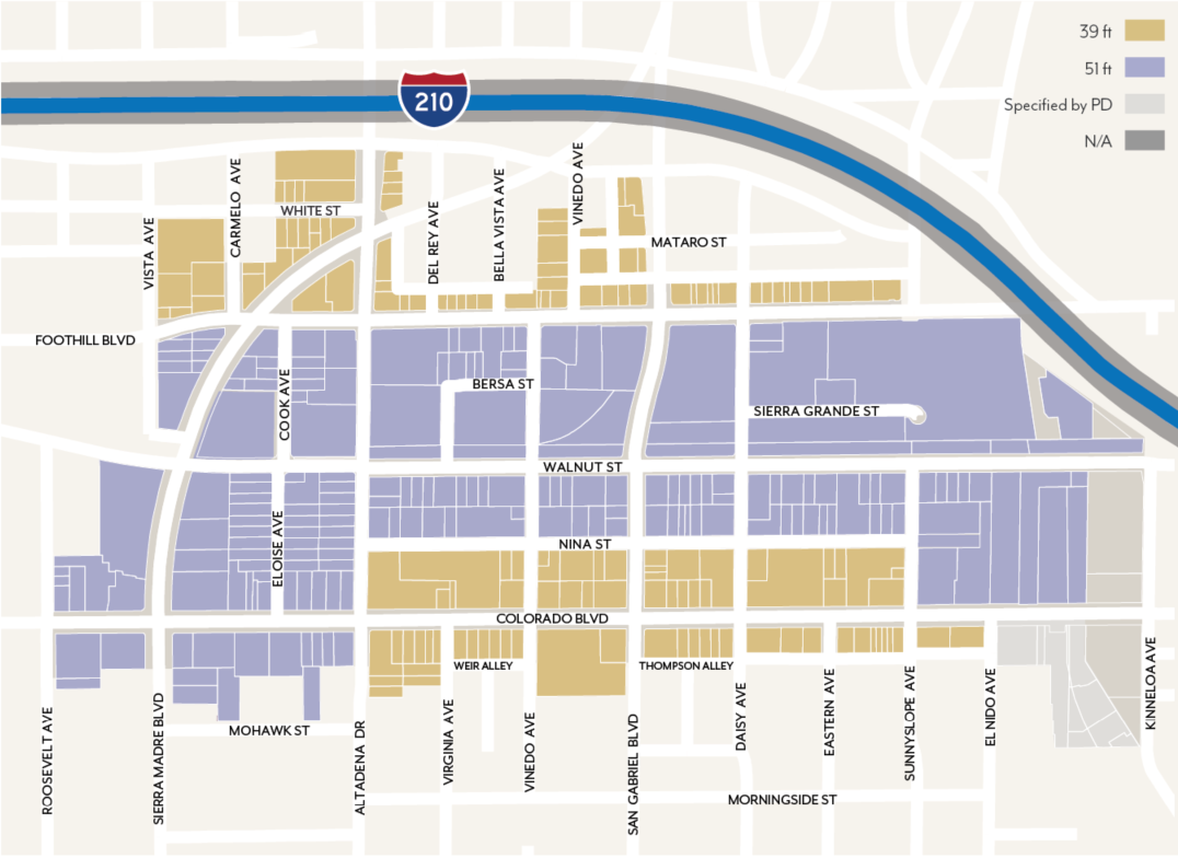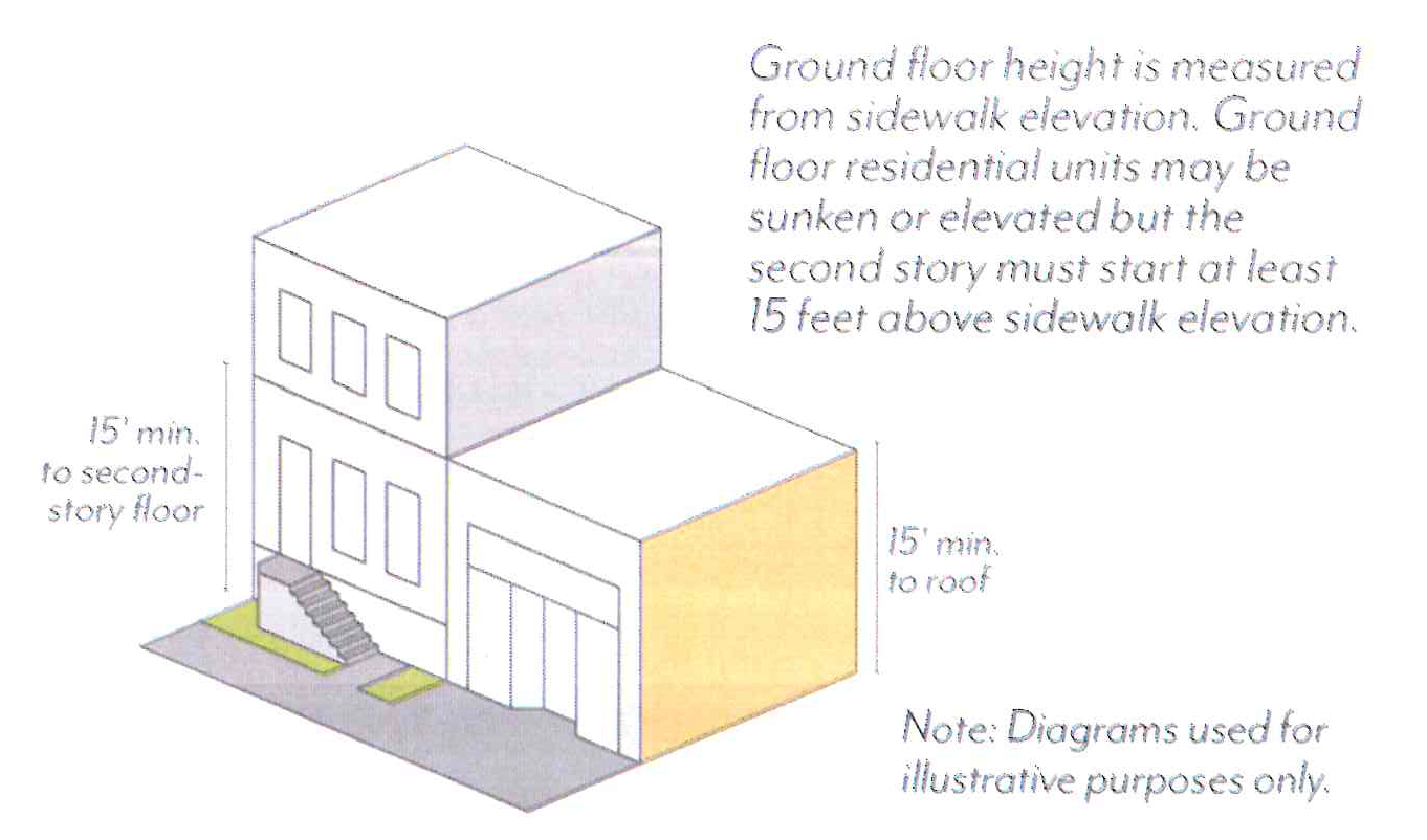 Minimum Height. Buildings shall have a minimum ground floor height of 12 feet, except those facing Colorado Boulevard, Foothill Boulevard, Sierra Madre Boulevard or Walnut Street, which shall have a minimum ground floor height of 15 feet. This height is measured from sidewalk elevation closest to the primary entrance to the second story floor or roof of a one-story building; see Figure LPSP-21.