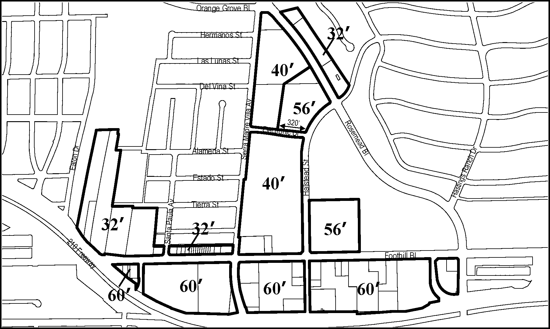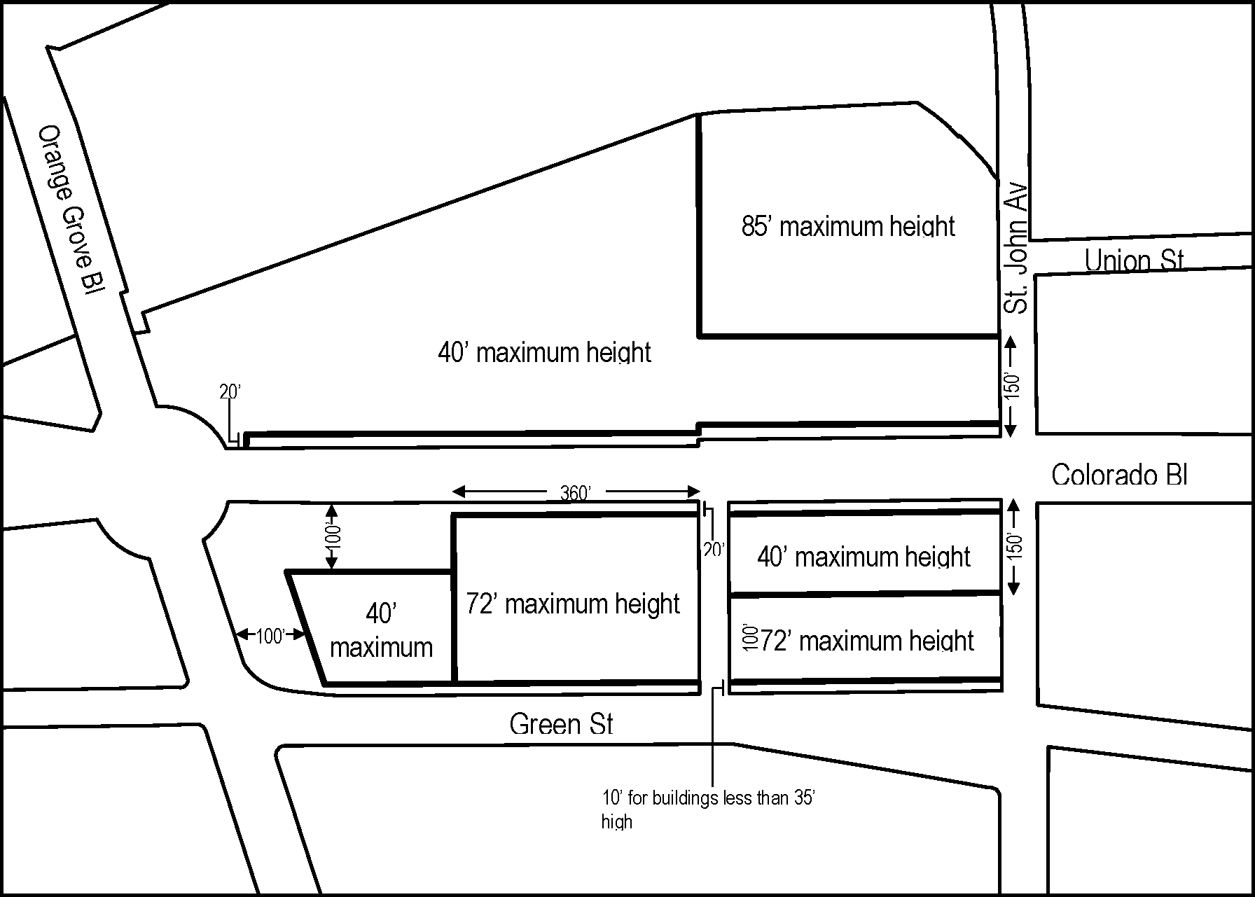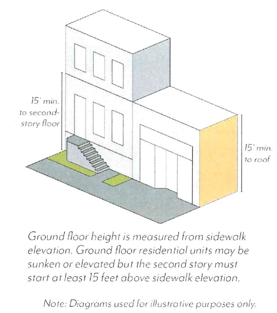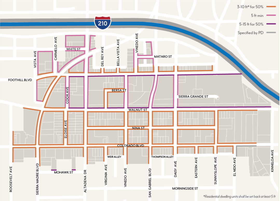Minimum Height. Buildings shall have a minimum ground floor height of 12 feet, except those facing Colorado Boulevard, Foothill Boulevard, Sierra Madre Boulevard or Walnut Street, which shall have a minimum ground floor height of 15 feet. This height is measured from sidewalk elevation closest to the primary entrance to the second story floor or roof of a one-story building; see Figure LPSP-21.