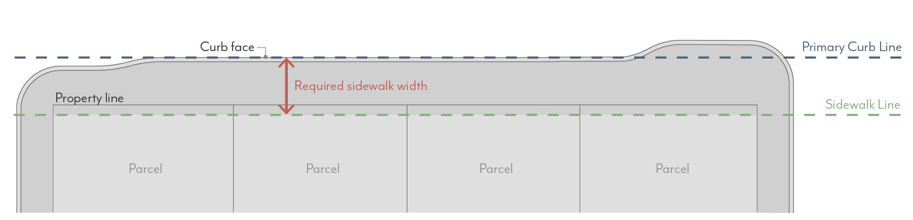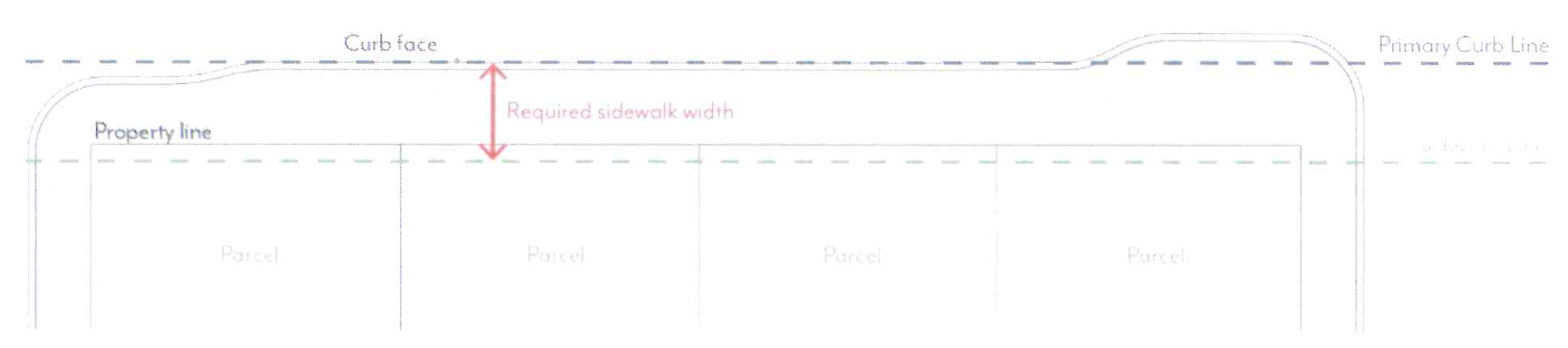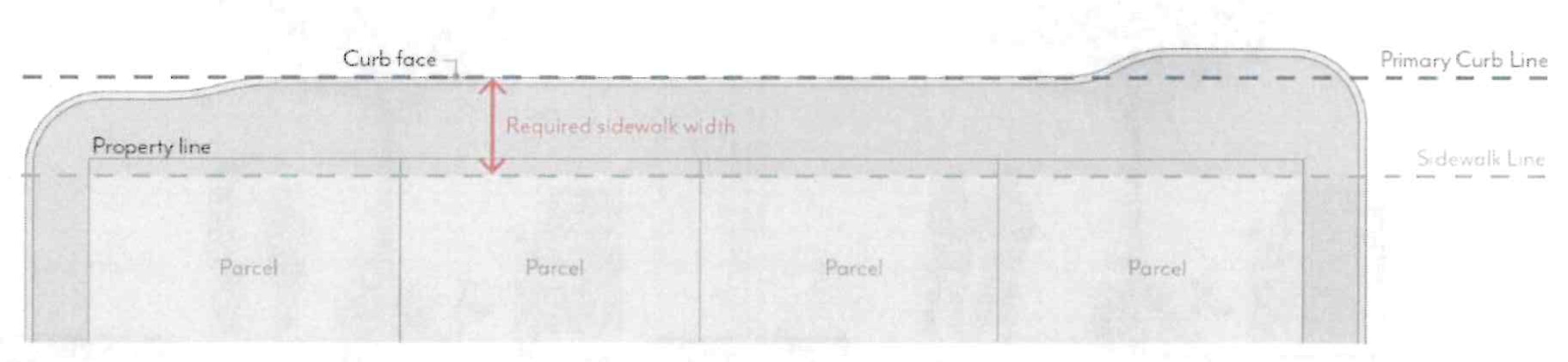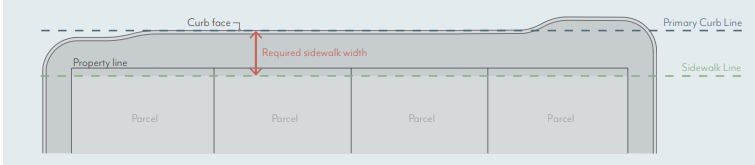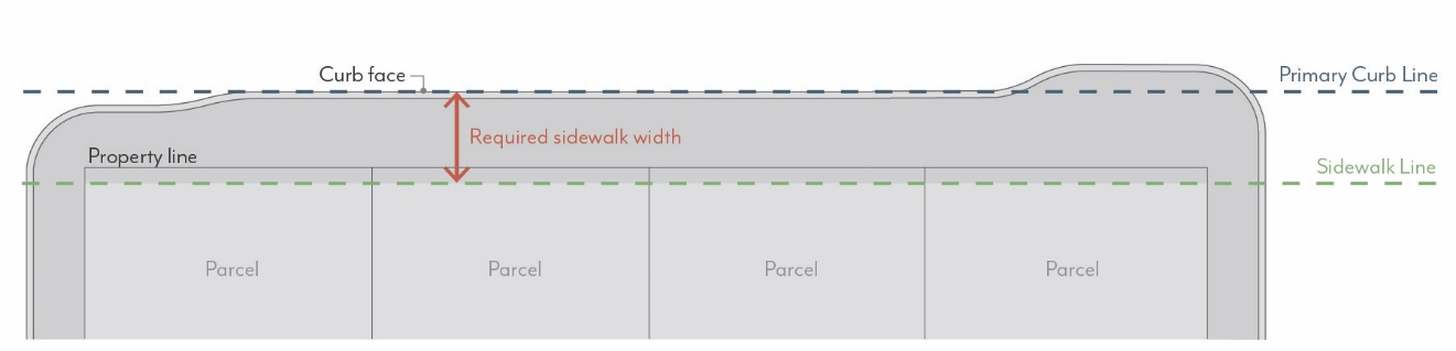 Sidewalks are measured from the Primary Curb Line of each block to the sidewalk line, as illustrated in Figure CDSP-3.