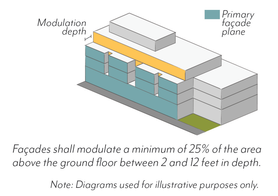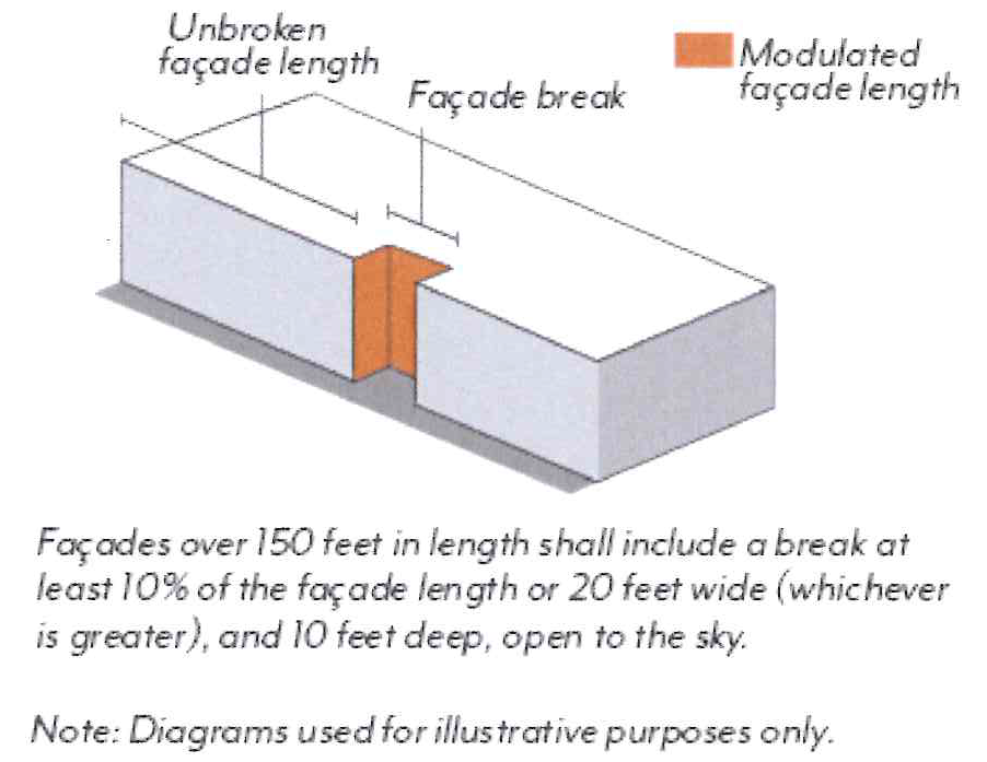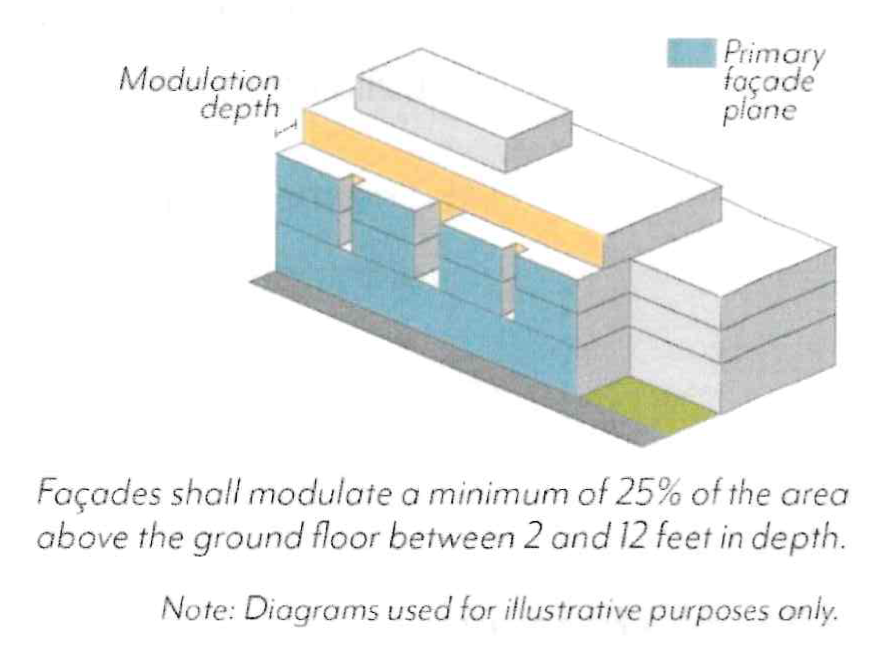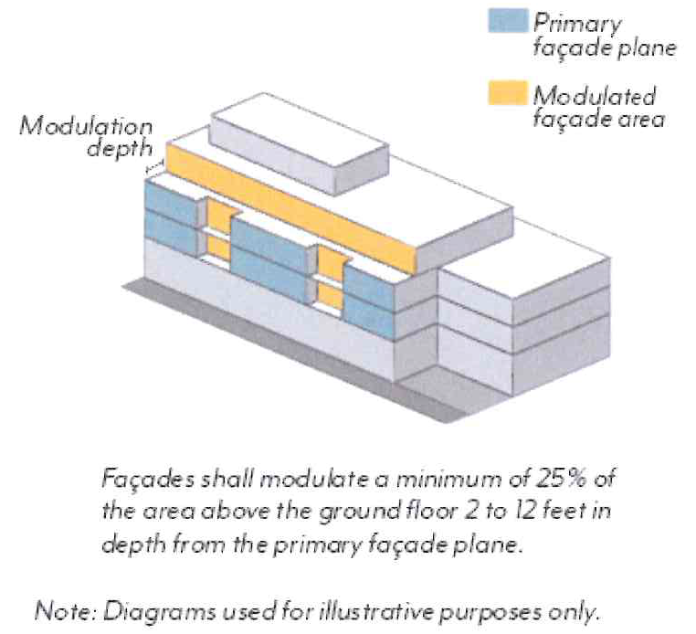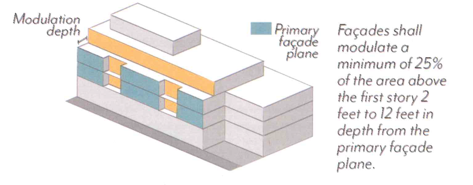 Required stepbacks (Section 17.38.060.E), façade breaks (Section 17.38.060.G.1), and projected balconies (Section 17.38.070.G.1) shall not count toward the modulation requirement; balconies that are recessed a minimum of 2 feet shall qualify.