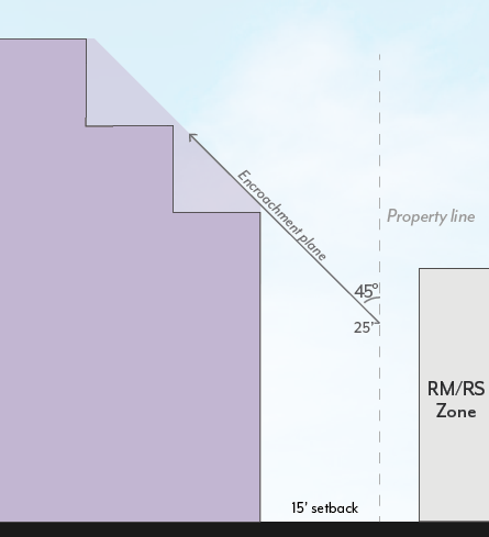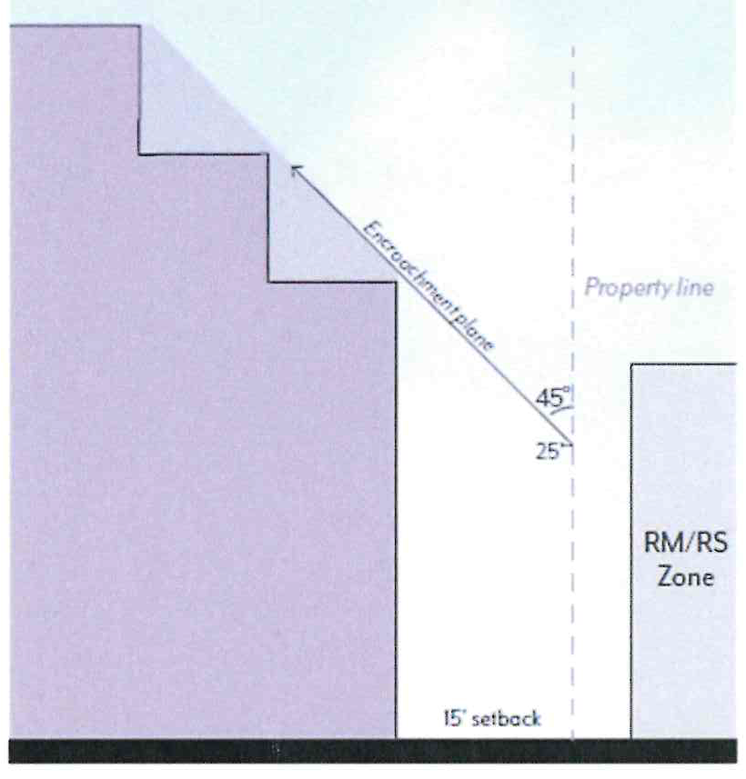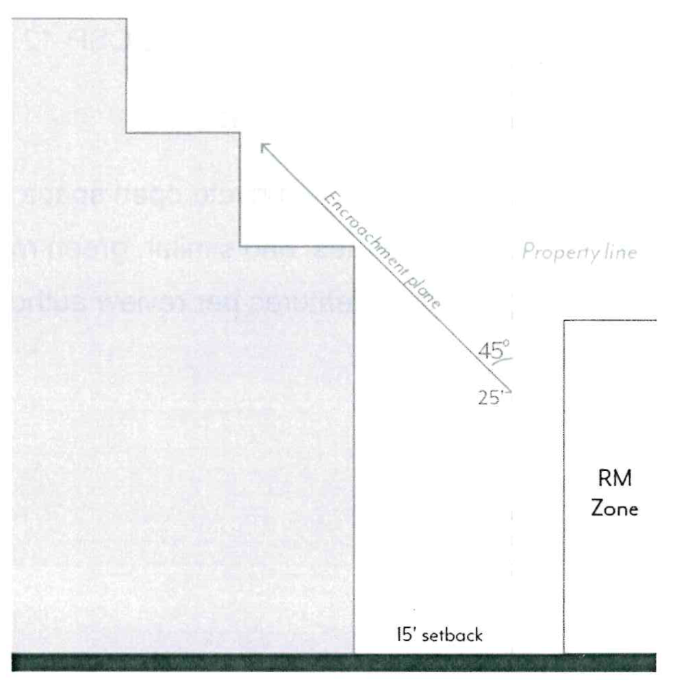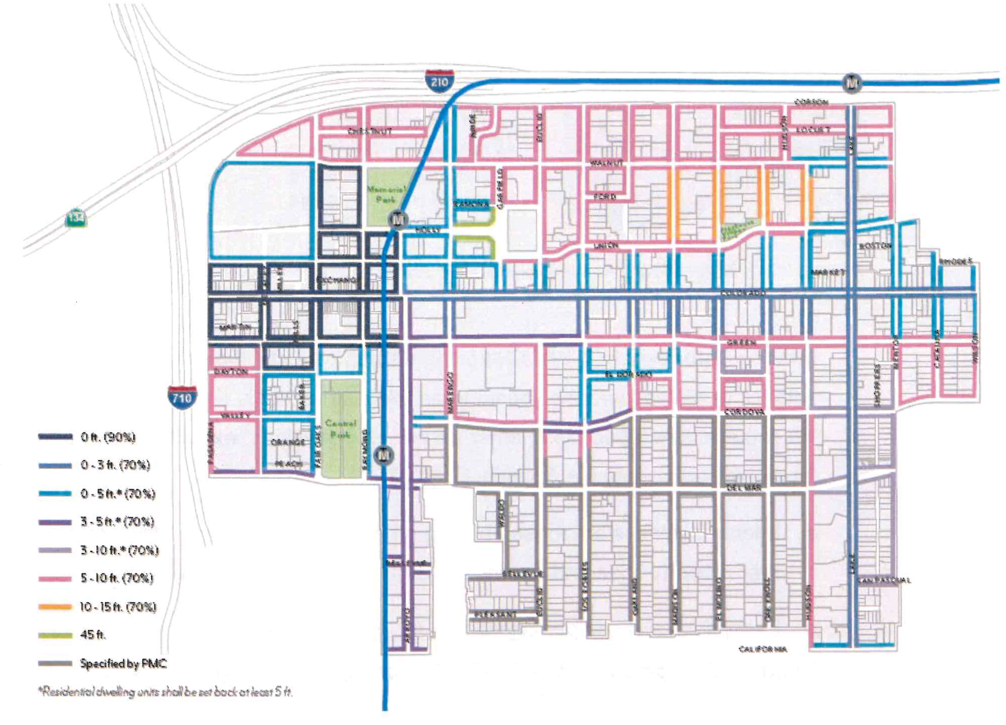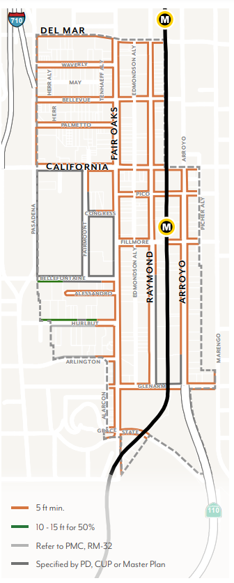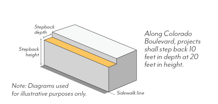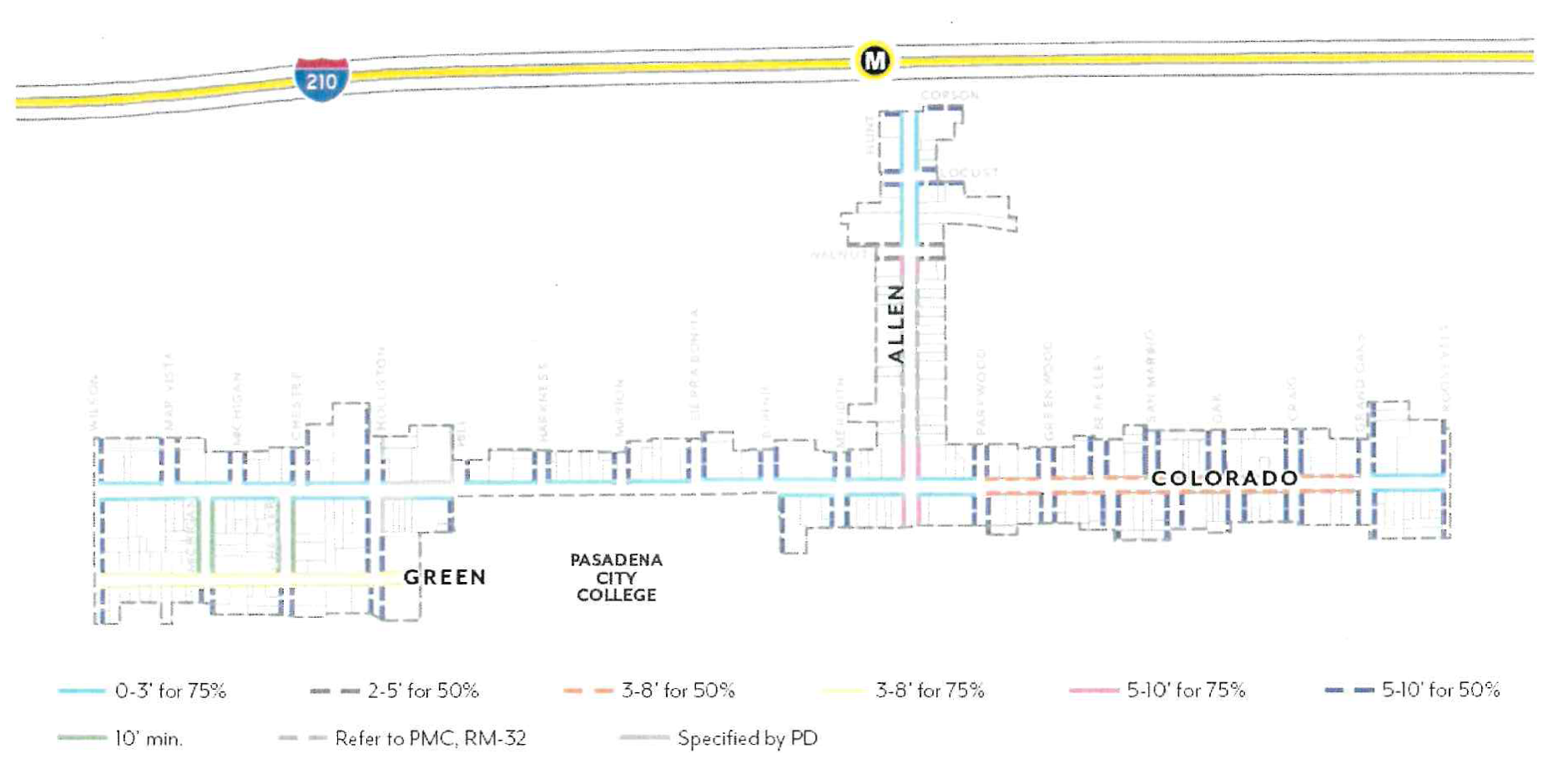 Underground Parking. Subterranean parking shall be set back a minimum of 5 feet from Colorado Boulevard and RM/RS zoning. Otherwise, it may extend up to the property line.