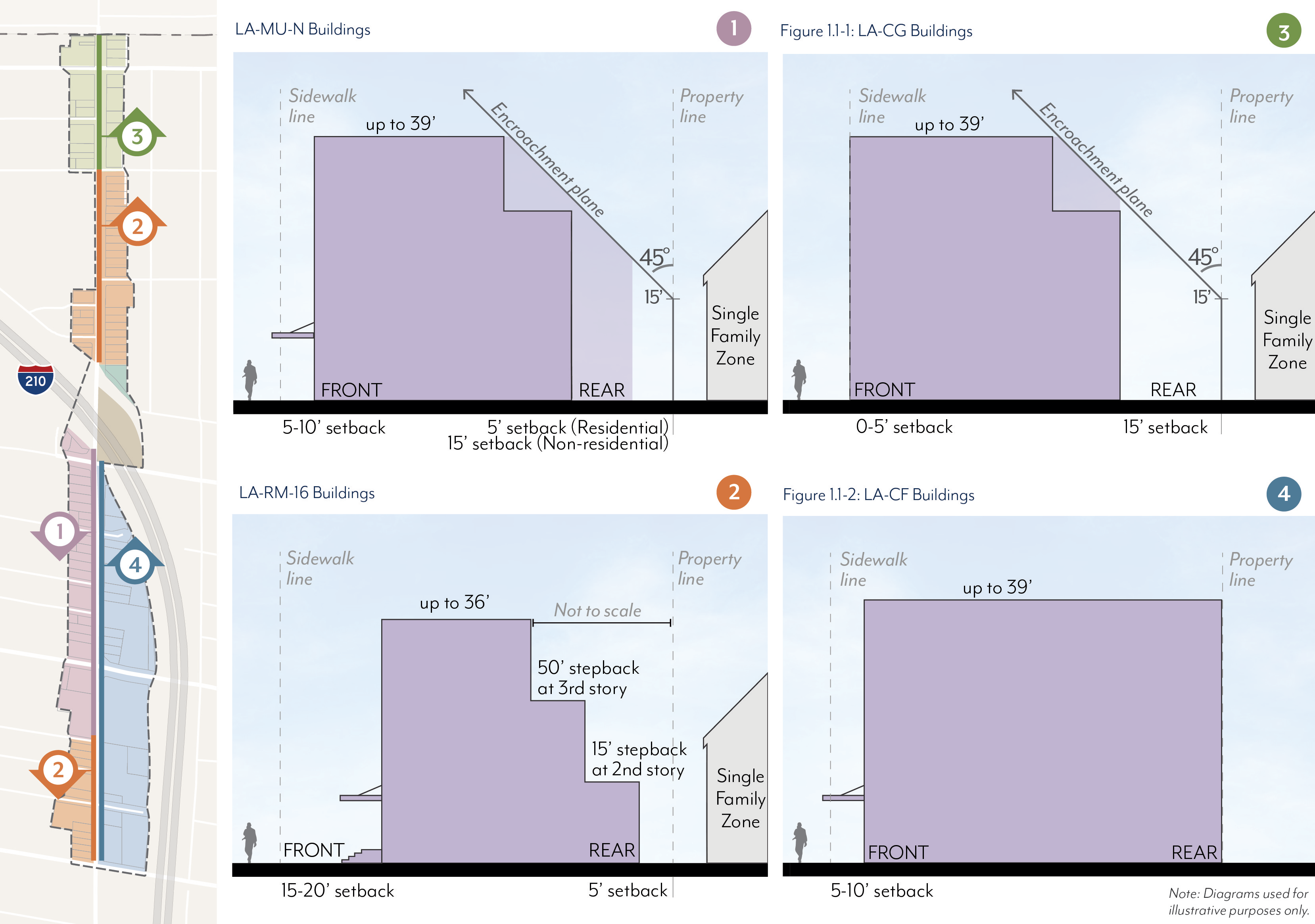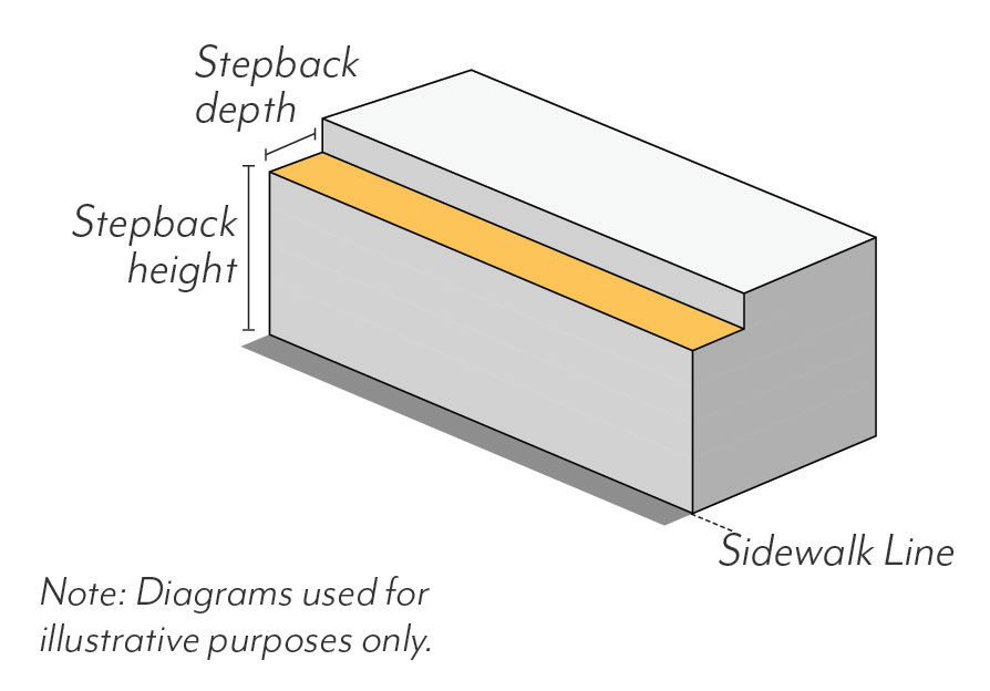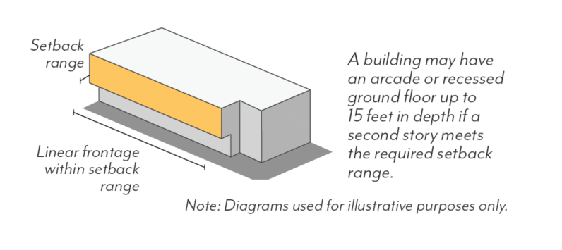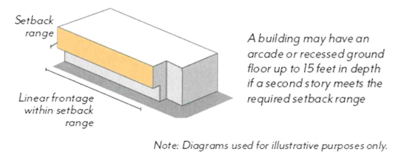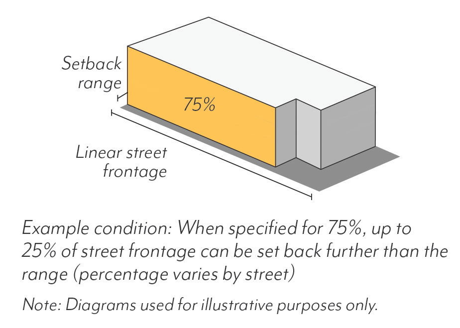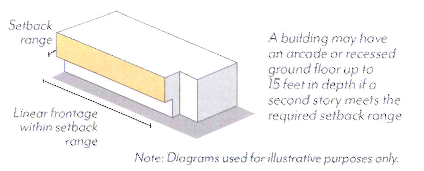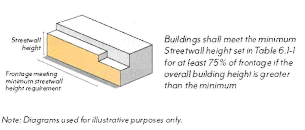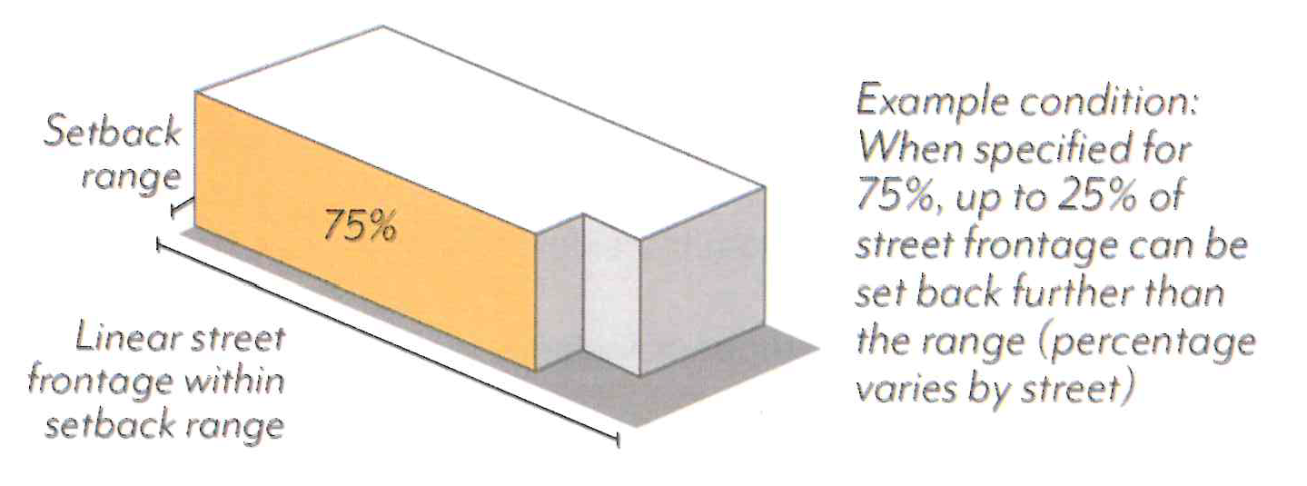 In Mixed-Use zoning districts, ground floor use requirements are regulated by frontage type per Figure LPSP-18 and Table LPSP-5. All use requirements are regulated as a percentage of the building frontage.