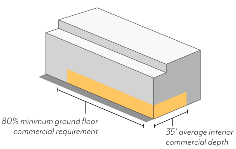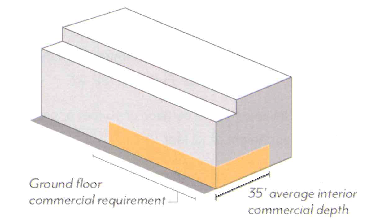 Support projects that are entirely commercial or mixed-use, integrated vertically, consistent with ground floor use requirements.