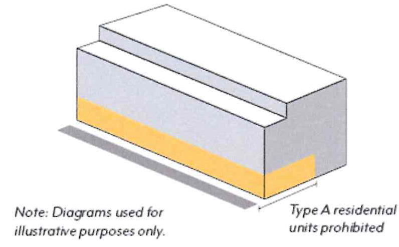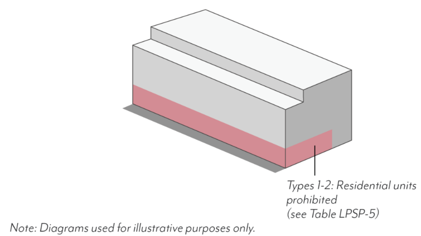 Types 1, 2: Residential units on the ground floor shall be prohibited within 35 feet of the sidewalk line, inclusive of setbacks, per Table LPSP-5; see Figure LPSP-20.