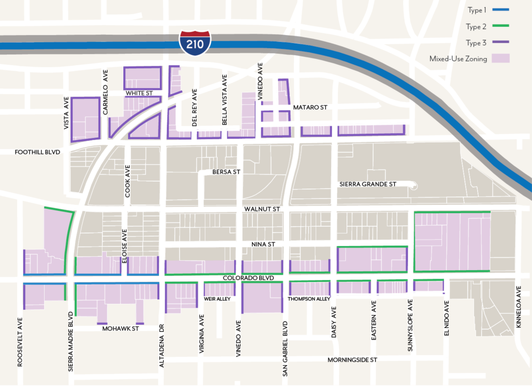 Identify areas of East Colorado Boulevard, which are appropriate locations for developing mixed-use and housing projects, and areas where commercial development should be concentrated.