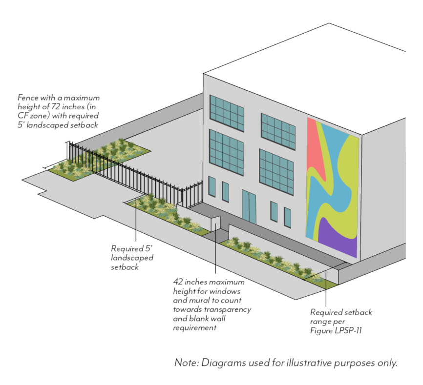 Street-facing transparency that is obstructed by walls or fences taller than 42 inches will not be counted toward the required transparency; see Figure LPSP-22.