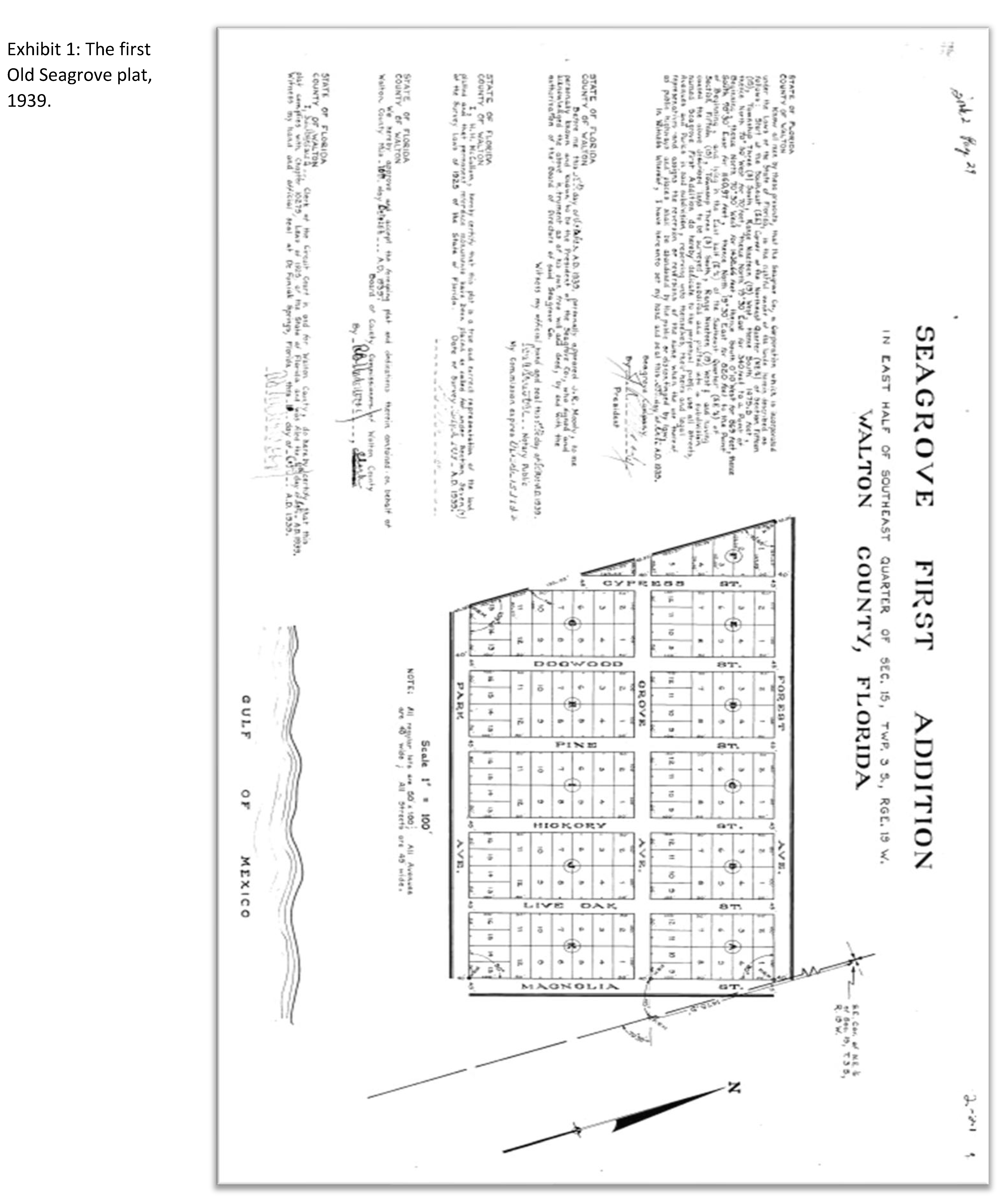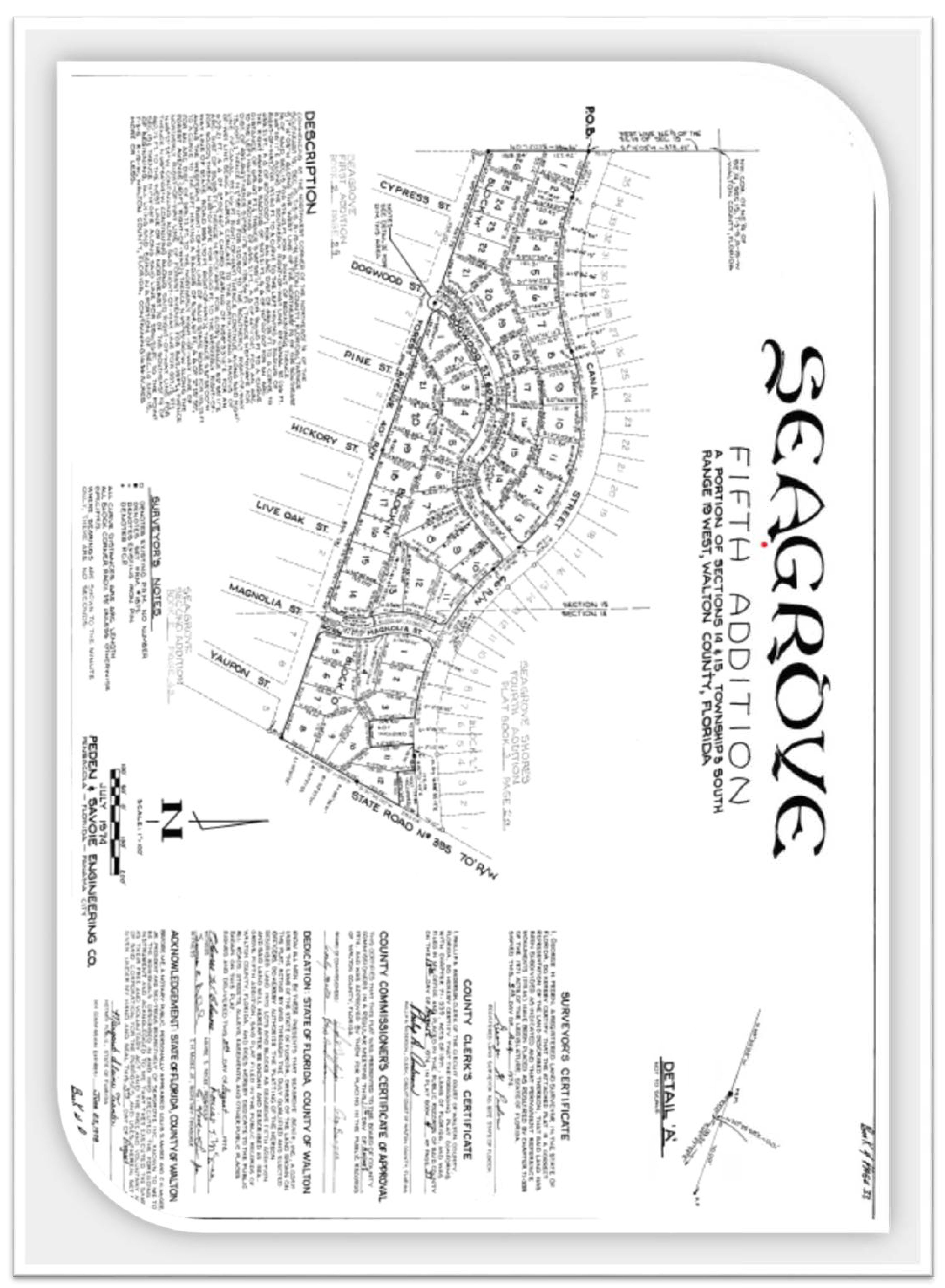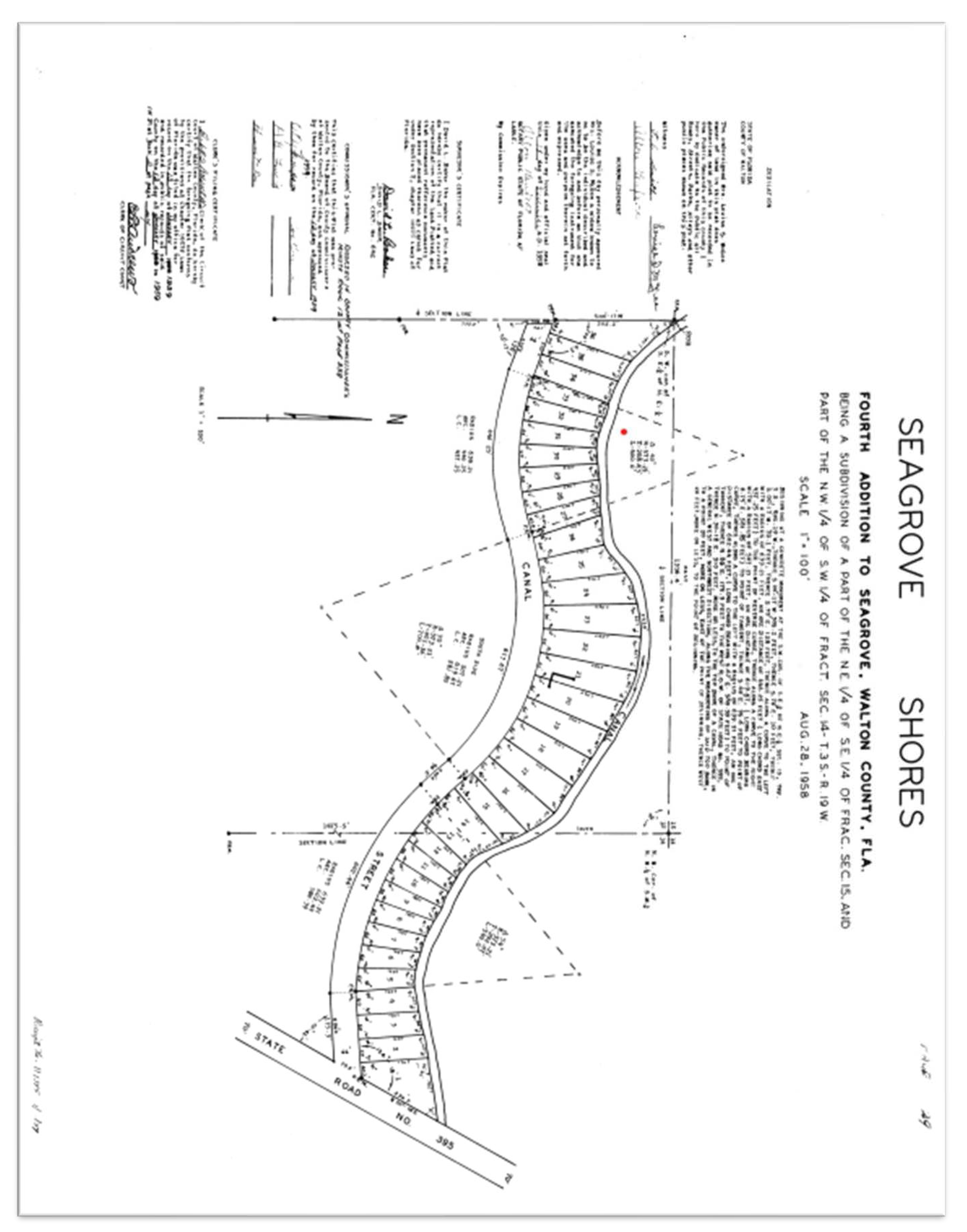 The Old Seagrove Neighborhood beach is identified in the October 16, 1939 recorded Plat Book 2, Page 29, instrument no. 101082. A covenant and easement agreement were recorded in Deed Book 122, Page 530, by Ely Andrews, Clerk of Circuit Court, granting the public use of the beach sands from the bluff line to the mean high-water line: recorded plat for Seagrove First Addition on April 21, 1953, by Ely Andrews, Clerk of Circuit Court, Deed Book 122 page 530: