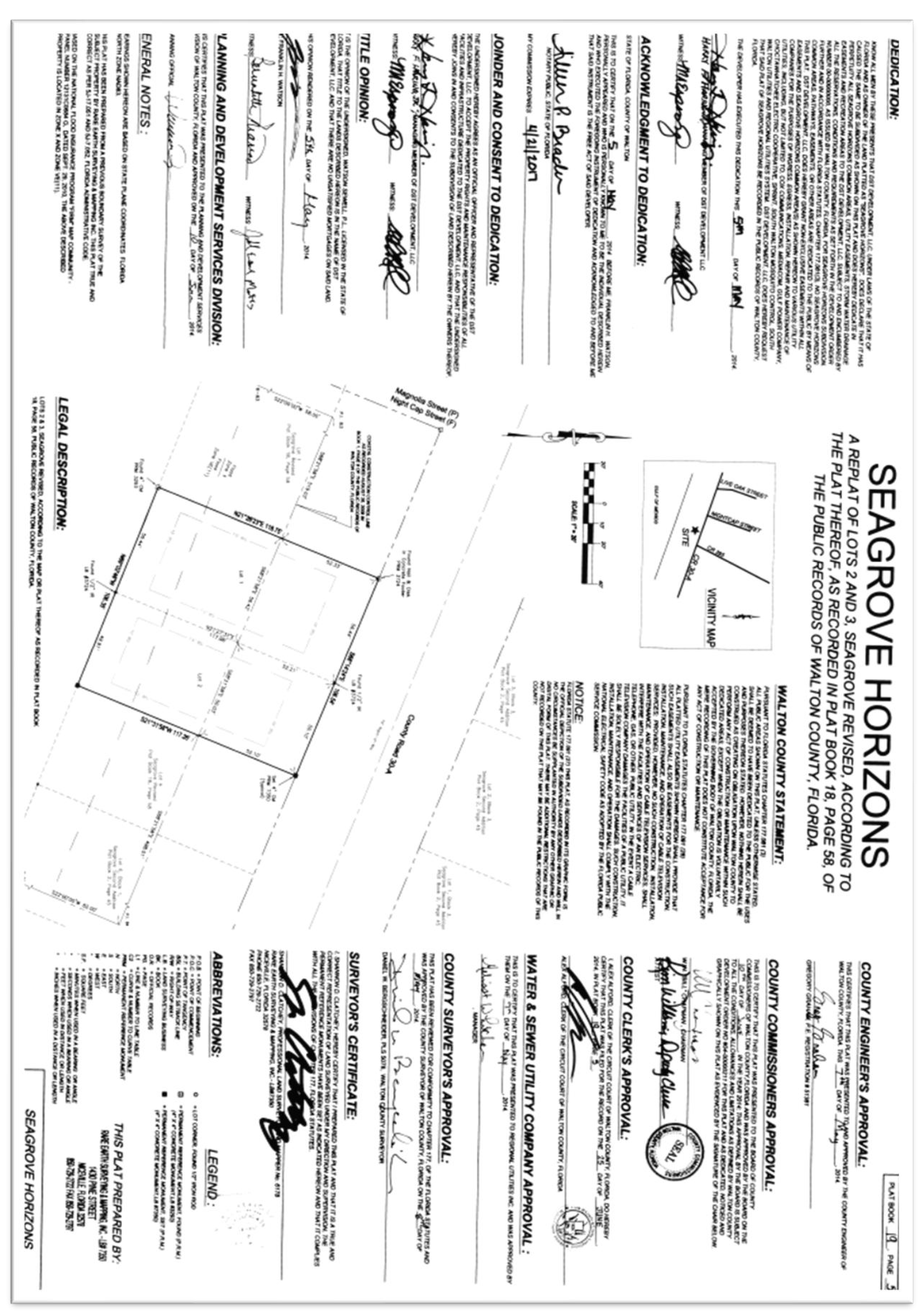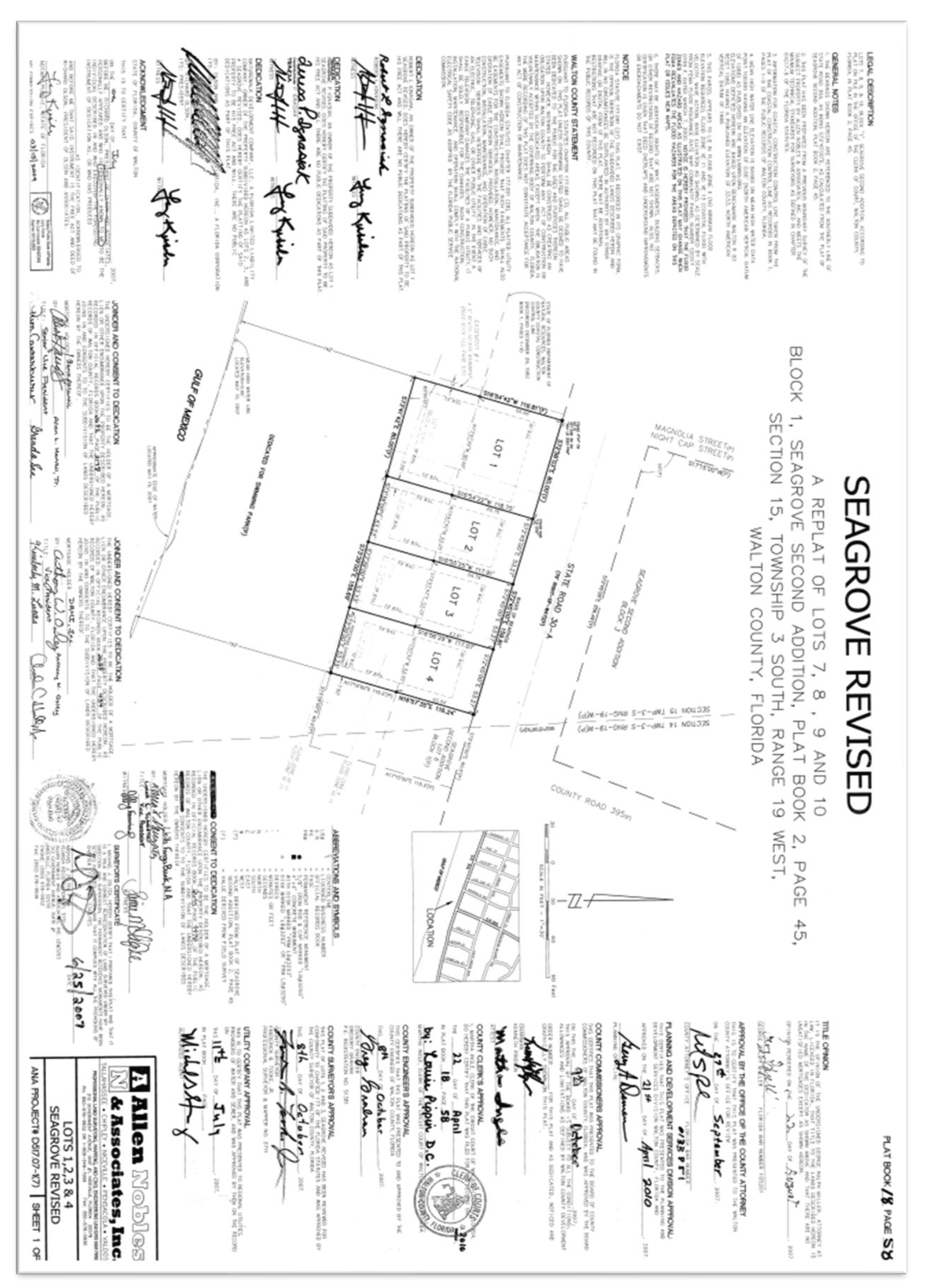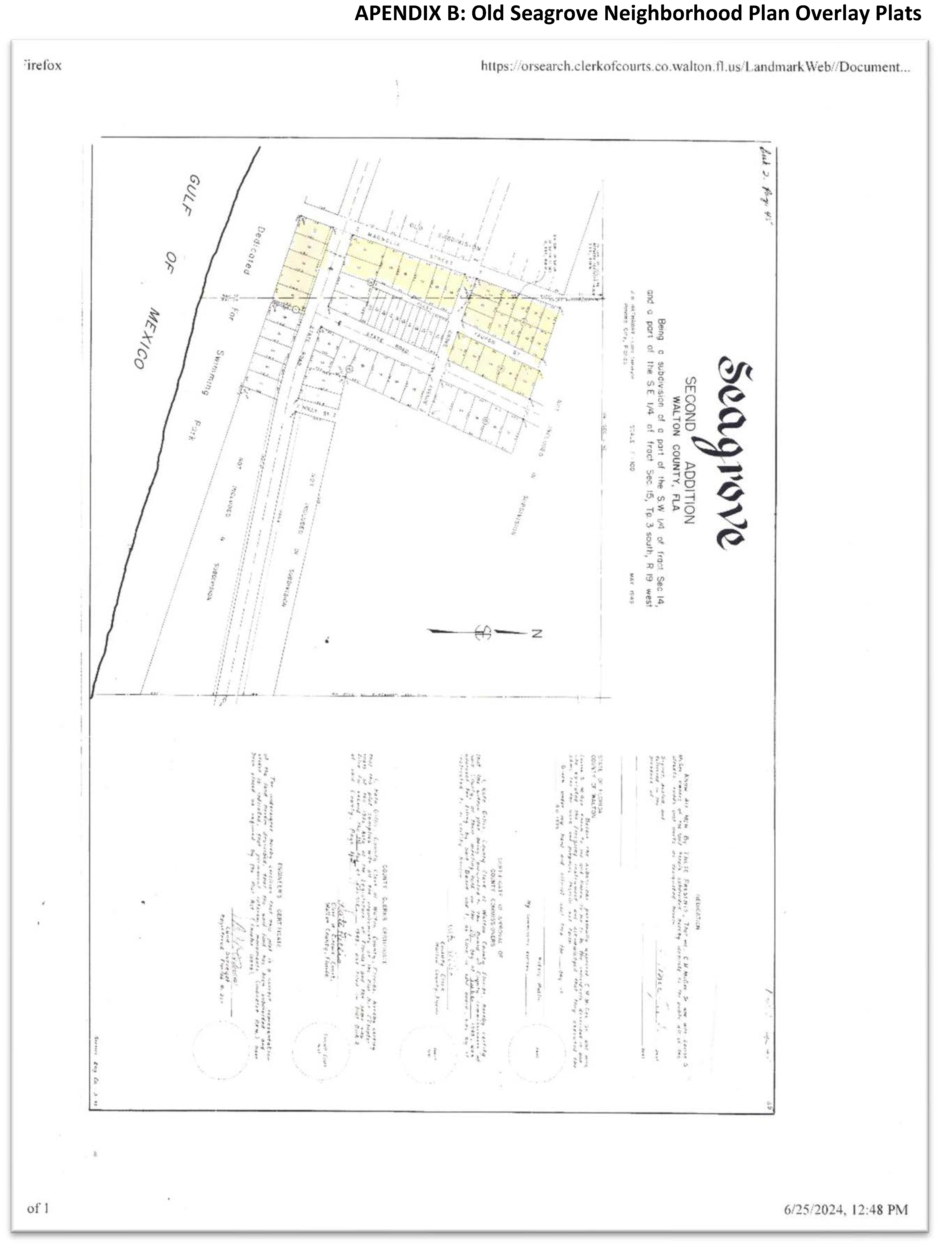 The Old Seagrove Neighborhood beach is identified in the October 16, 1939 recorded Plat Book 2, Page 29, instrument no. 101082. A covenant and easement agreement were recorded in Deed Book 122, Page 530, by Ely Andrews, Clerk of Circuit Court, granting the public use of the beach sands from the bluff line to the mean high-water line: recorded plat for Seagrove First Addition on April 21, 1953, by Ely Andrews, Clerk of Circuit Court, Deed Book 122 page 530: