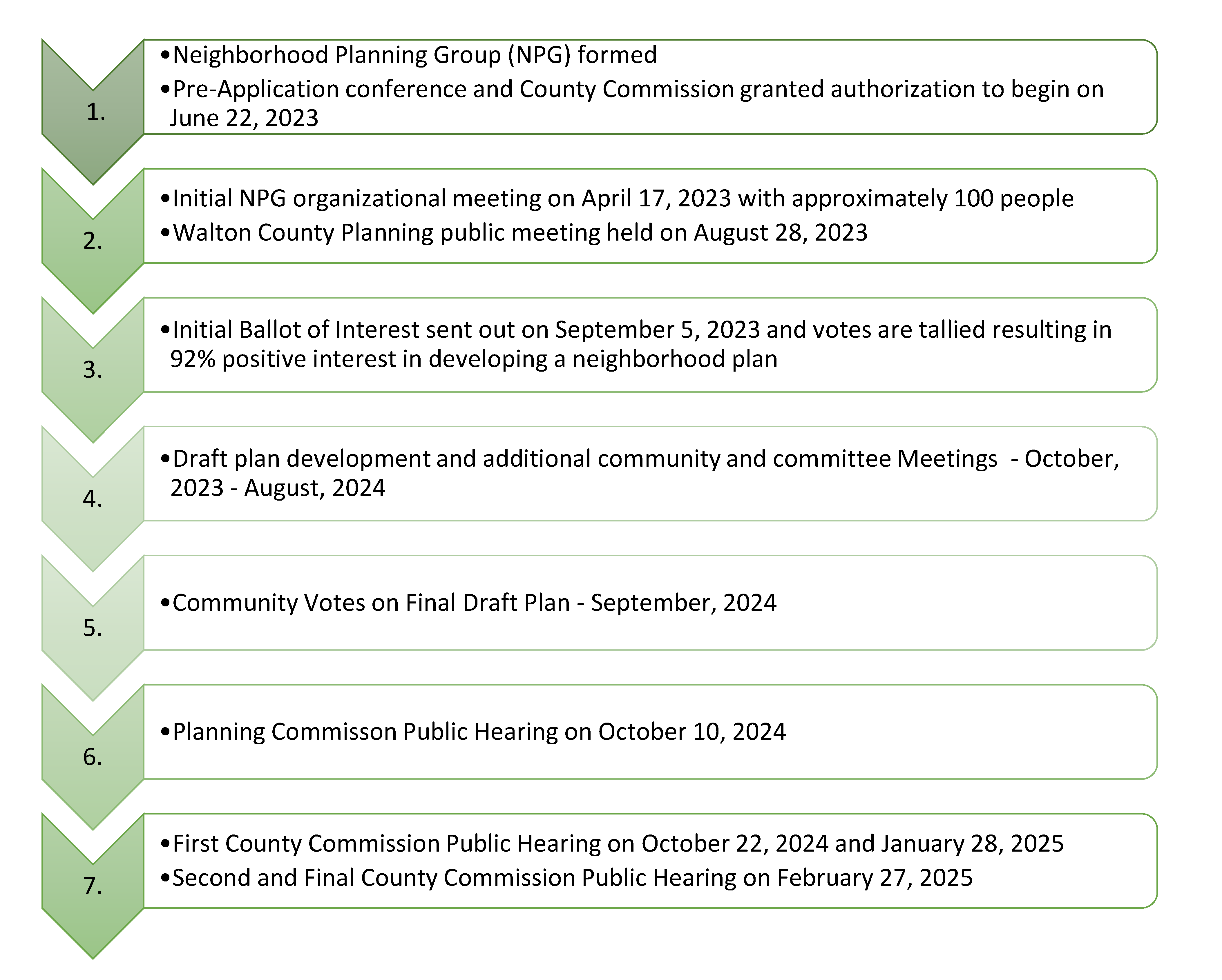 This Neighborhood Plan was developed in accordance with the Walton County Comprehensive Plan and Land Development Code (the CODE). Walton County encourages the preparation of Neighborhood Plans to guide development within the Residential Future Land Use Map Category. In 2008, Walton County adopted a Neighborhood Planning Ordinance to allow such plans to be adopted as overlay districts, thereby expediting the neighborhood plan approval process and promoting these citizen-based planning efforts. Walton County's requirements for neighborhood plans are contained in Chapter 8 of the Walton County Land Development Code. The following is a summary of key milestones and dates for the development of this Neighborhood Plan following the process outlined in the Walton County Land Development Code. This Plan is a result of these efforts and the collaboration of all those who participated and offered input.