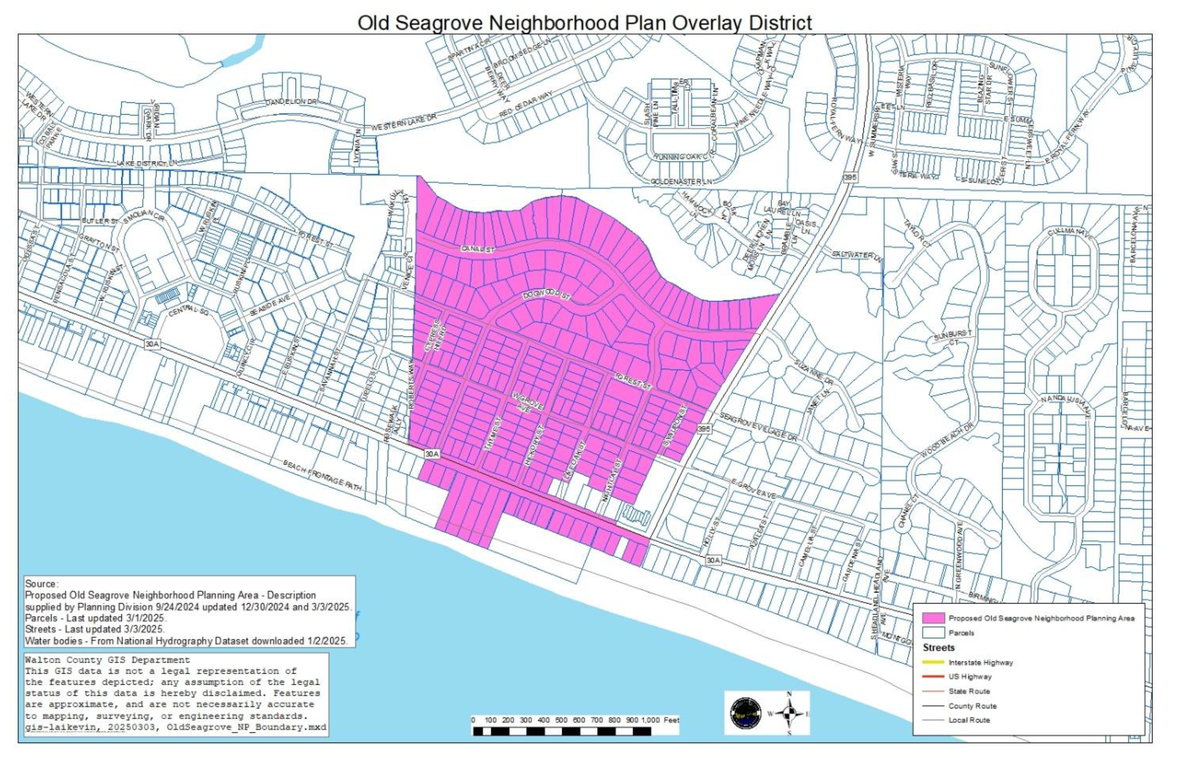 Old Seagrove is defined as all single-family residential properties bounded to the west by the Seaside community, to the east by County Road 395 including the 395 Beach Access, to the south by the Gulf of Mexico, and to the north by a Western Lake tributary. These features insulate the neighborhood to some extent but also make it a very desirable tourist destination.