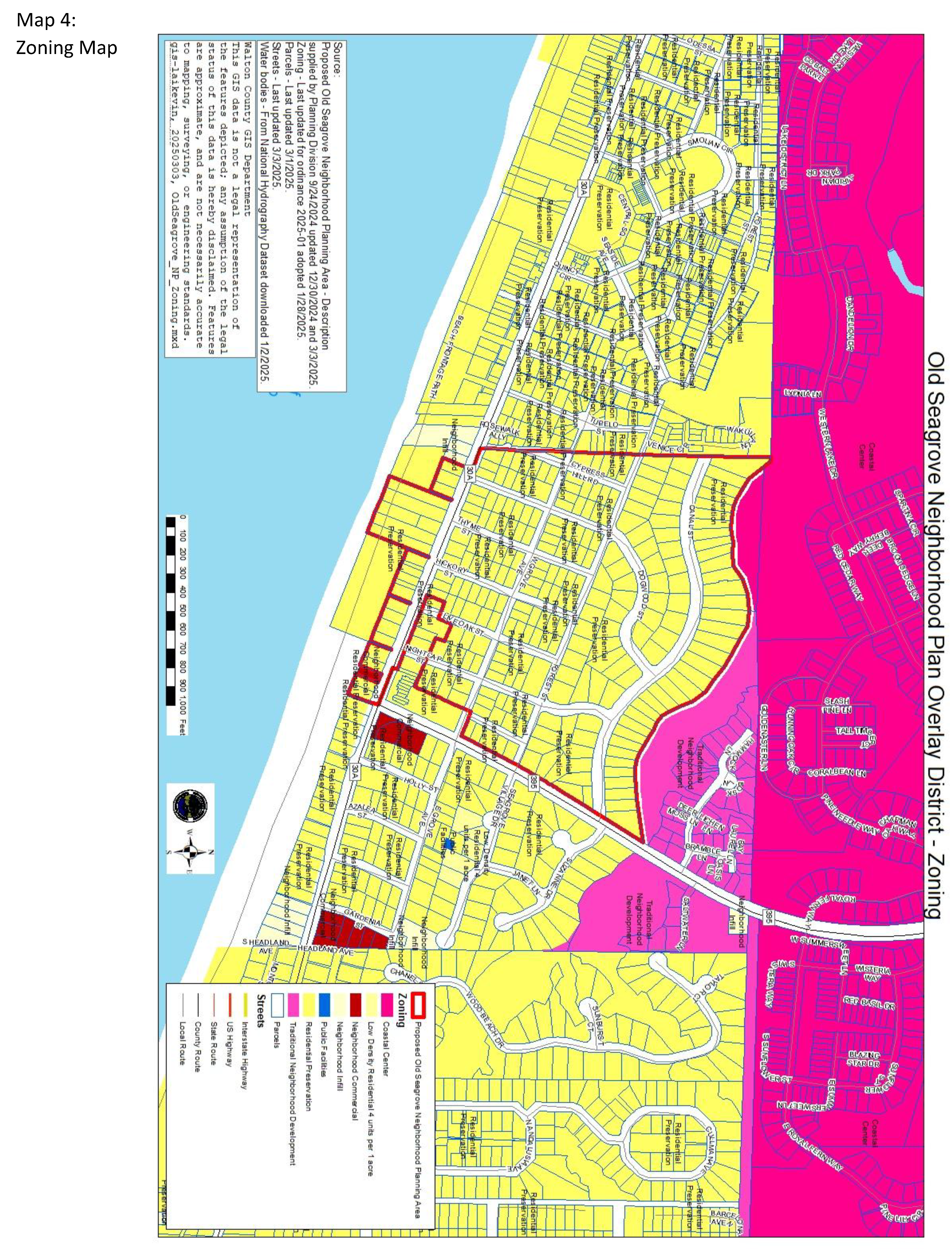 The Old Seagrove Neighborhood Plan area shall maintain the Residential Preservation Zoning (RP) District with the exception of parcel 15-3S-19-25600-000-0020 which is zoned Neighborhood Commercial. The land use in place at the time of the adoption of this Plan is depicted on Maps 3 and 4. The following development standards apply to the RP Zoning district within the Old Seagrove Neighborhood Plan Overlay District: