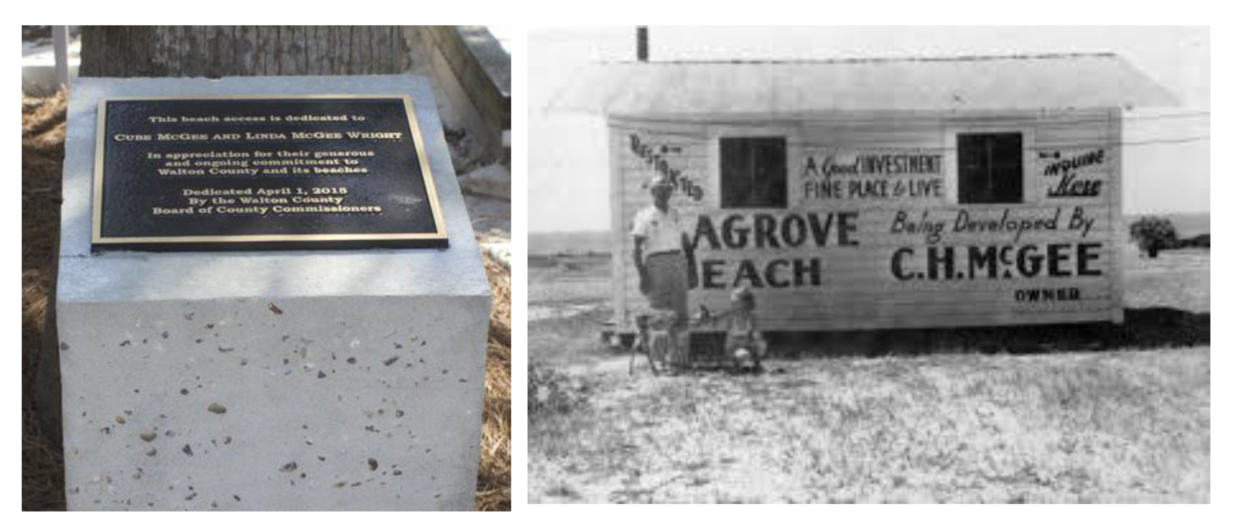 A plaque commemorates Linda McGee Wright and Cube McGee at the Live Oak beach access. Photo Credit: https://waltonoutdoors.com/south-walton-pioneer-c-h-mcgee-known-as-mr-seagrove/
