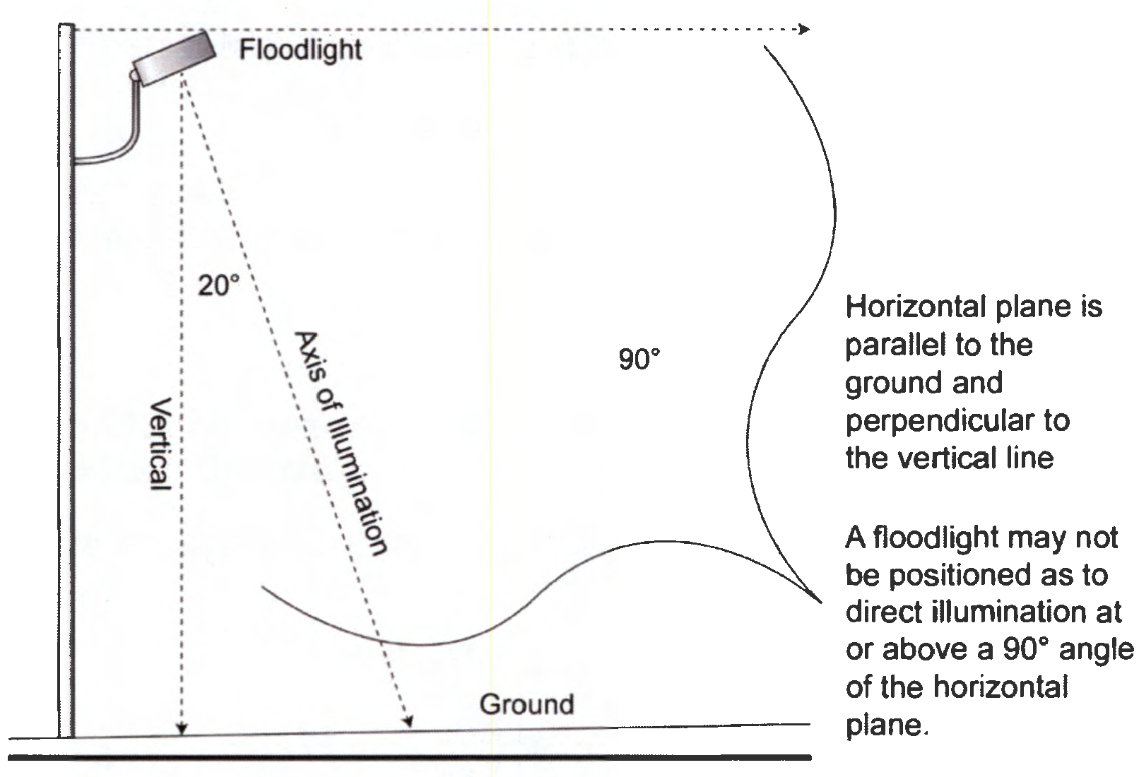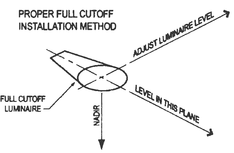 All new standards street lights within Critical Approach 1 or 2 subzones shall utilize full cutoff type luminaires that are installed level to the ground in two intersecting perpendicular planes see exhibit below, and should be horizontally level in all directions.