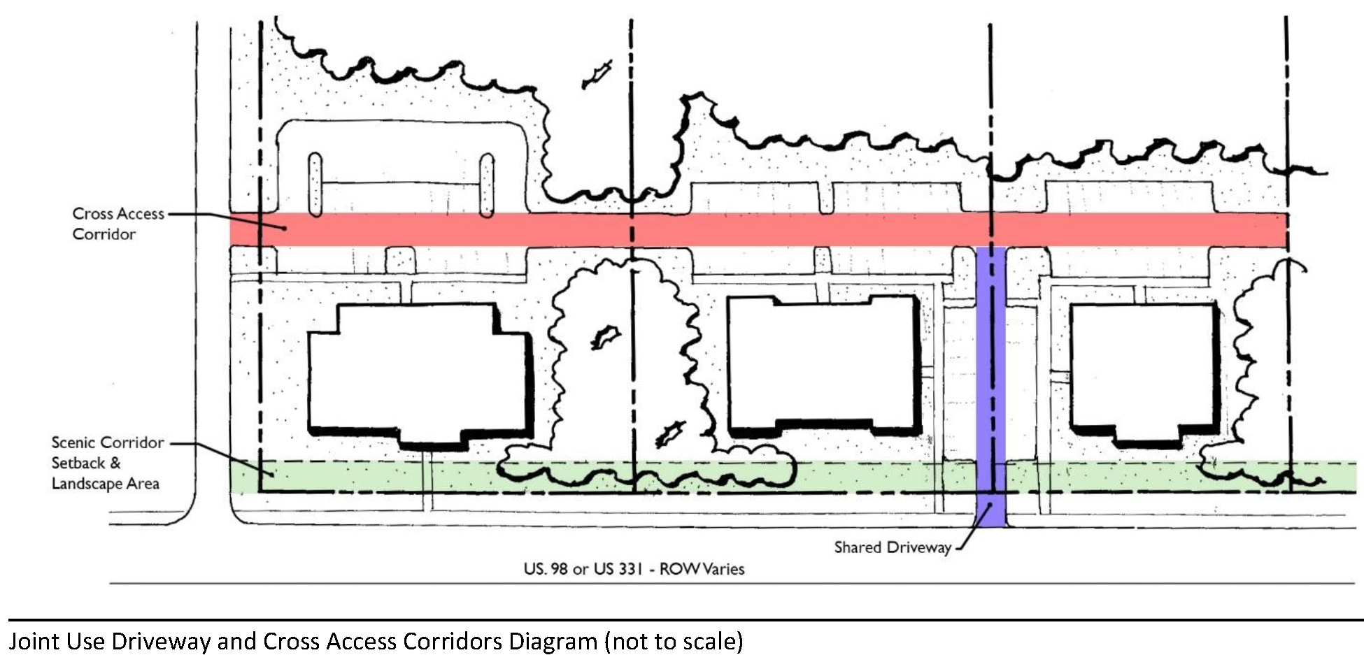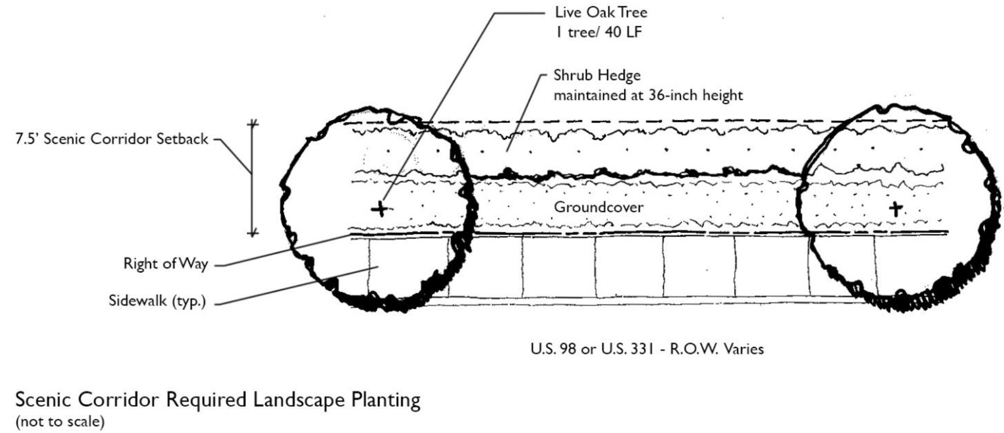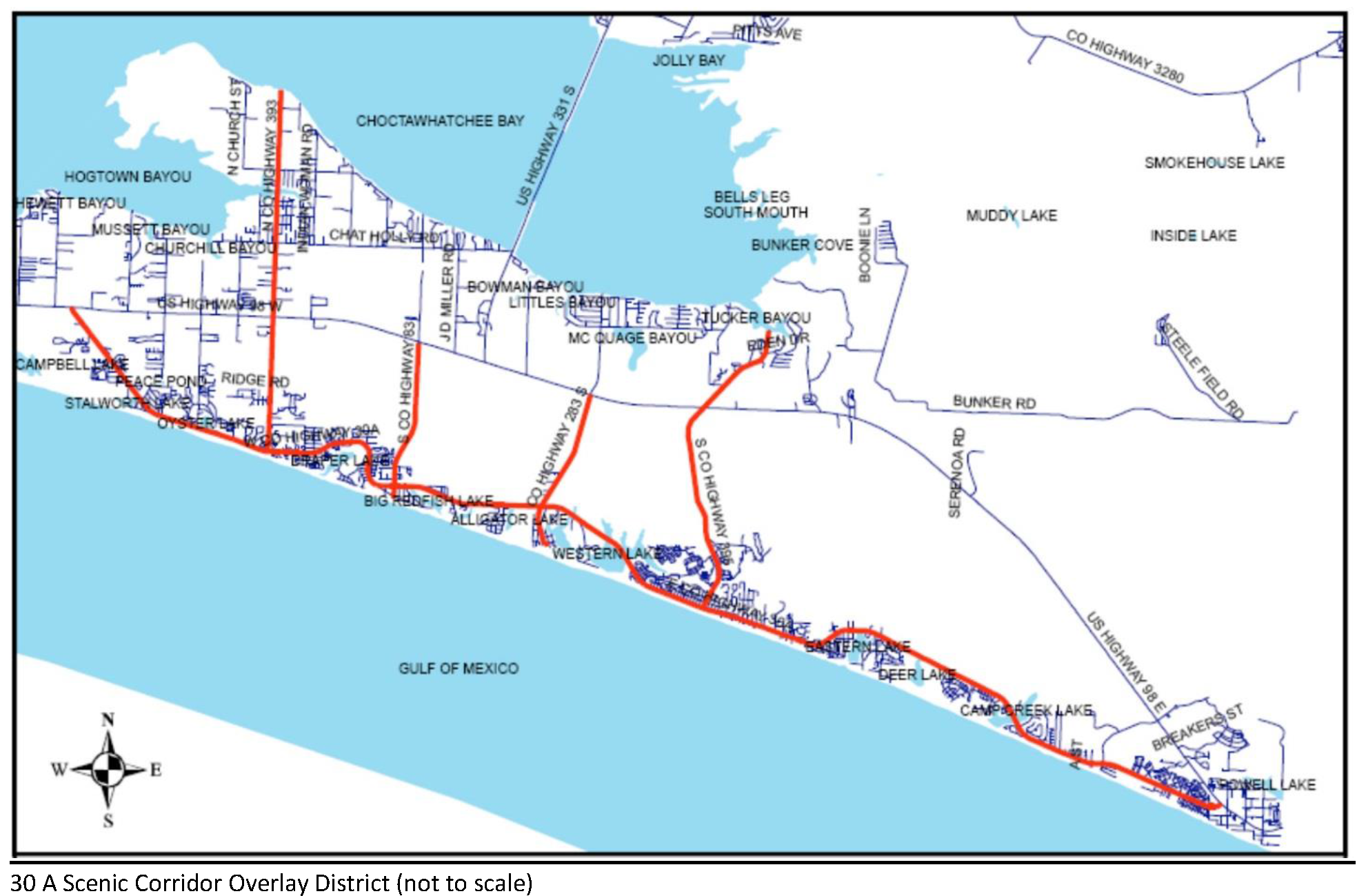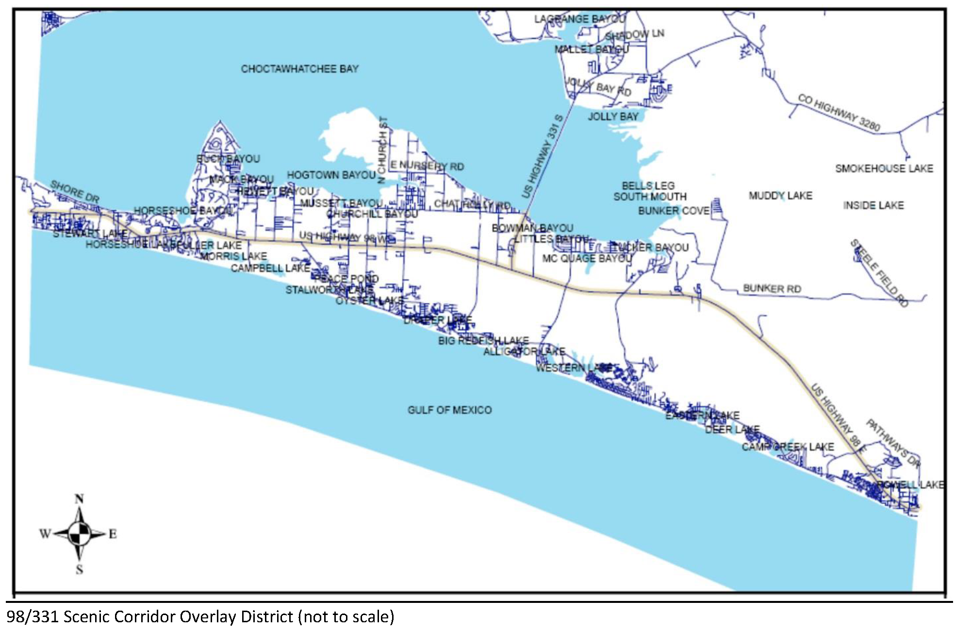 The Scenic Corridor width extends 400 feet east and 400 feet west of the outward edges of the U.S. 331 right-of-way from U.S. Highway 98 north to the south end of the bridge at Choctawhatchee Bay.