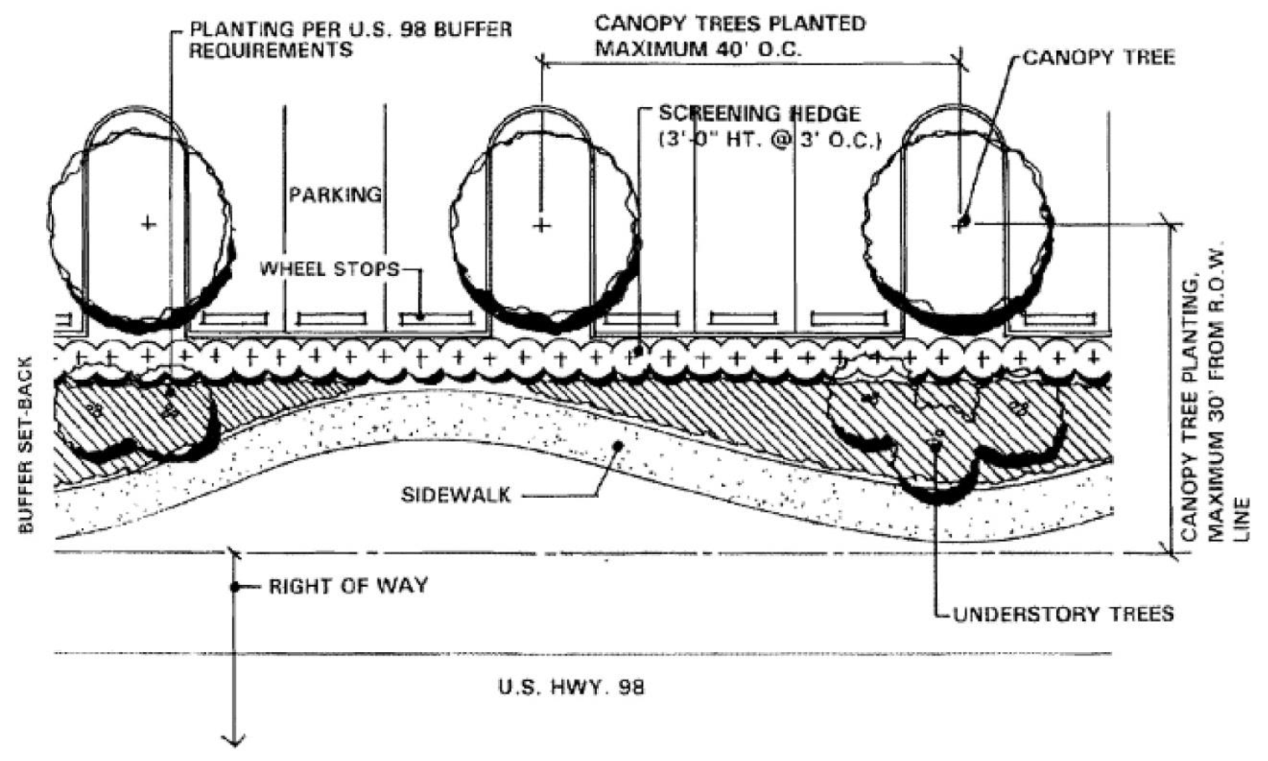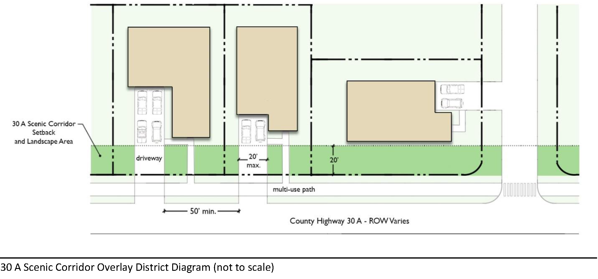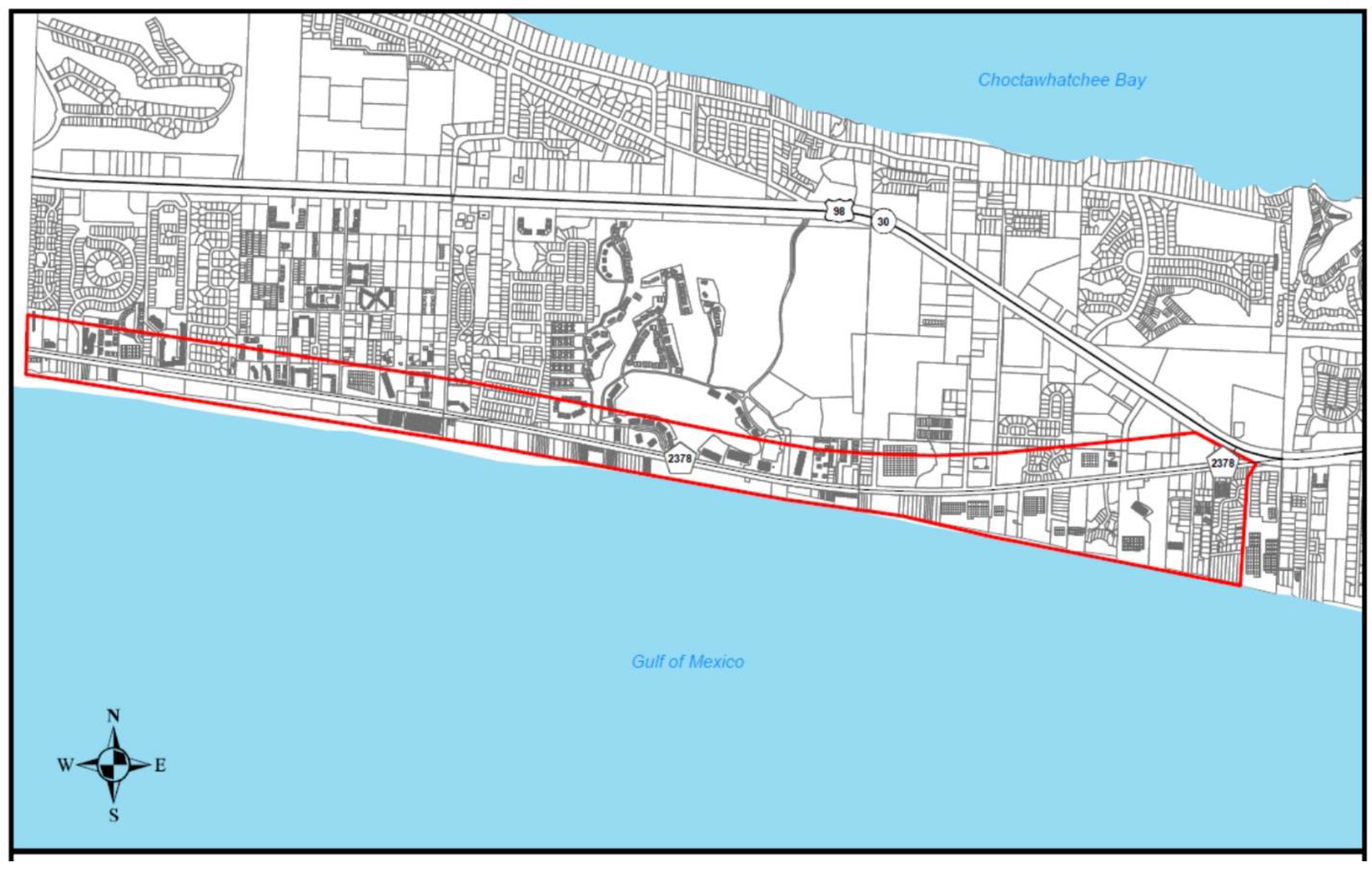 The Scenic Corridor width extends 400 feet north and 400 feet south of the outward edges of U.S. Highway 98 right-of-way from the Okaloosa/Walton County line east to the Walton/Bay County line.