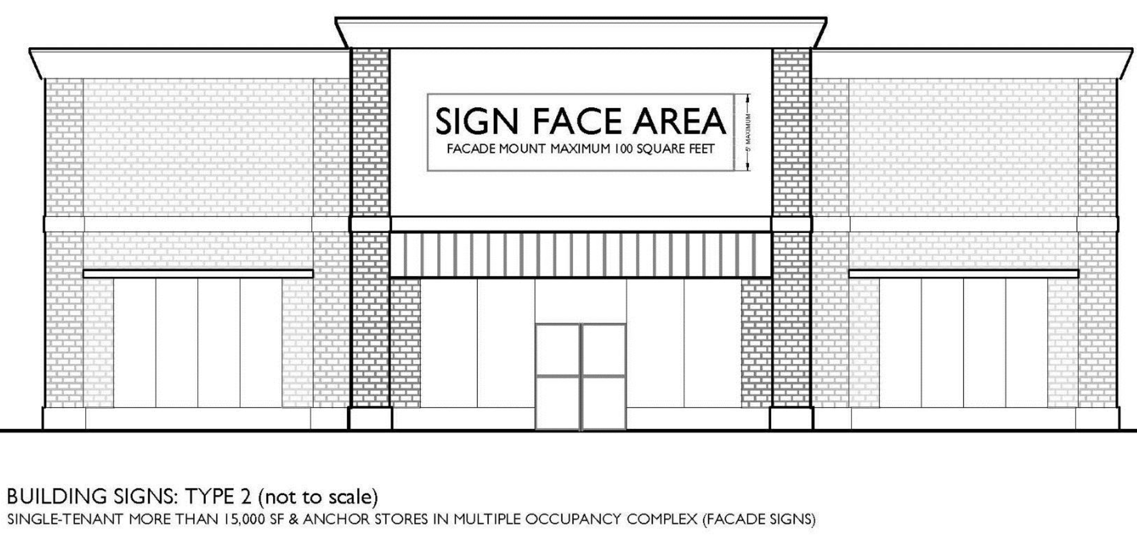 The total amount of building signs allowed shall be two (2) square feet of signage per one (1) linear foot of addressed business frontage, not to exceed sixty-four (64) square feet.